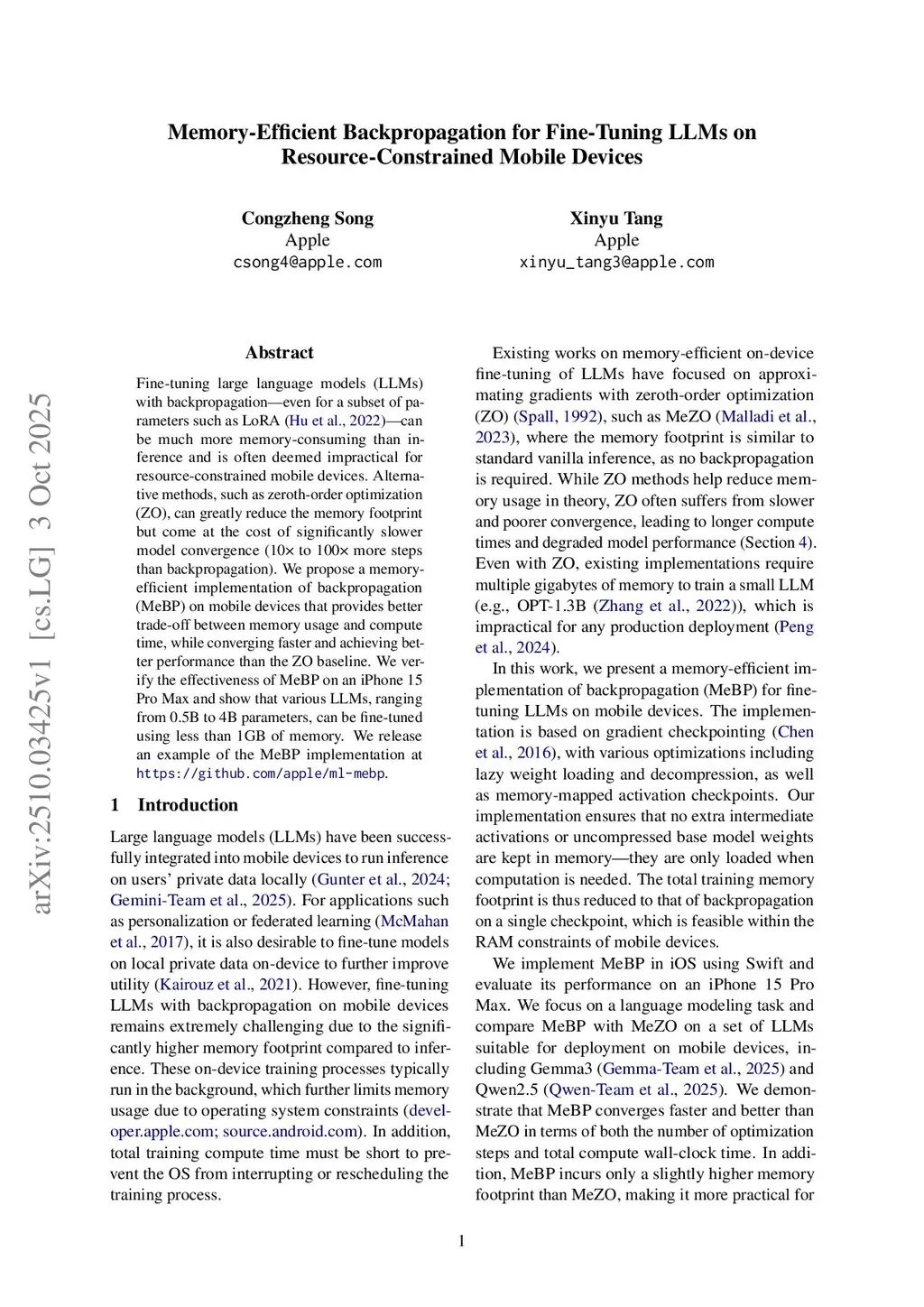 Fine-tuning large language models (LLMs) with backpropagation\textemdash even for a subset of parameters such as LoRA\textemdash can be much more memory-consuming than inference and is often deemed impractical for resource-constrained mobile devices. Alternative methods, such as zeroth-order optimization (ZO), can greatly reduce the memory footprint but come at the cost of significantly slower model convergence (10 to 100 more steps than backpropagation). We propose a memory-efficient implementation of backpropagation (MeBP) on mobile devices that provides better trade-off between memory usage and compute time, while converging faster and achieving better performance than the ZO baseline. We verify the effectiveness of MeBP on an iPhone 15 Pro Max and show that various LLMs, ranging from 0.5B to 4B parameters, can be fine-tuned using less than 1GB of memory. We release an example of the MeBP implementation atthis https URL.