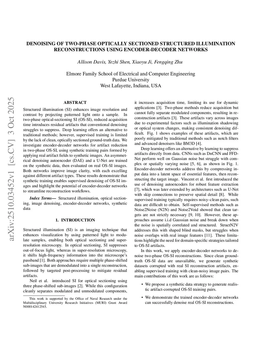 Structured illumination (SI) enhances image resolution and contrast by projecting patterned light onto a sample. In two-phase optical-sectioning SI (OS-SI), reduced acquisition time introduces residual artifacts that conventional denoising struggles to suppress. Deep learning offers an alternative to traditional methods; however, supervised training is limited by the lack of clean, optically sectioned ground-truth data. We investigate encoder-decoder networks for artifact reduction in two-phase OS-SI, using synthetic training pairs formed by applying real artifact fields to synthetic images. An asymmetrical denoising autoencoder (DAE) and a U-Net are trained on the synthetic data, then evaluated on real OS-SI images. Both networks improve image clarity, with each excelling against different artifact types. These results demonstrate that synthetic training enables supervised denoising of OS-SI images and highlight the potential of encoder-decoder networks to streamline reconstruction workflows.