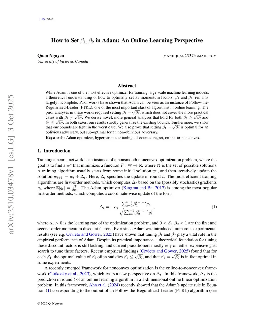 While Adam is one of the most effective optimizer for training large-scale machine learning models, a theoretical understanding of how to optimally set its momentum factors, and , remains largely incomplete.Prior works have shown that Adam can be seen as an instance of Follow-the-Regularized-Leader (FTRL), one of the most important class of algorithms in online learning.The prior analyses in these works required setting , which does not cover the more practical cases with .We derive novel, more general analyses that hold for both and .In both cases, our results strictly generalize the existing bounds.Furthermore, we show that our bounds are tight in the worst case.We also prove that setting is optimal for an oblivious adversary, but sub-optimal for an non-oblivious adversary.