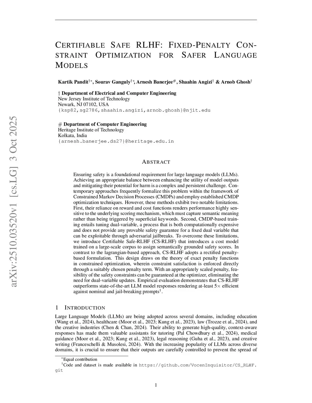 Ensuring safety is a foundational requirement for large language models (LLMs). Achieving an appropriate balance between enhancing the utility of model outputs and mitigating their potential for harm is a complex and persistent challenge. Contemporary approaches frequently formalize this problem within the framework of Constrained Markov Decision Processes (CMDPs) and employ established CMDP optimization techniques. However, these methods exhibit two notable limitations. First, their reliance on reward and cost functions renders performance highly sensitive to the underlying scoring mechanism, which must capture semantic meaning rather than being triggered by superficial keywords. Second, CMDP-based training entails tuning dual-variable, a process that is both computationally expensive and does not provide any provable safety guarantee for a fixed dual variable that can be exploitable through adversarial jailbreaks. To overcome these limitations, we introduce Certifiable Safe-RLHF (CS-RLHF) that introduces a cost model trained on a large-scale corpus to assign semantically grounded safety scores. In contrast to the lagrangian-based approach, CS-RLHF adopts a rectified penalty-based formulation. This design draws on the theory of exact penalty functions in constrained optimization, wherein constraint satisfaction is enforced directly through a suitably chosen penalty term. With an appropriately scaled penalty, feasibility of the safety constraints can be guaranteed at the optimizer, eliminating the need for dual-variable updates. Empirical evaluation demonstrates that CS-RLHF outperforms state-of-the-art LLM model responses rendering at-least 5 times efficient against nominal and jail-breaking prompts
