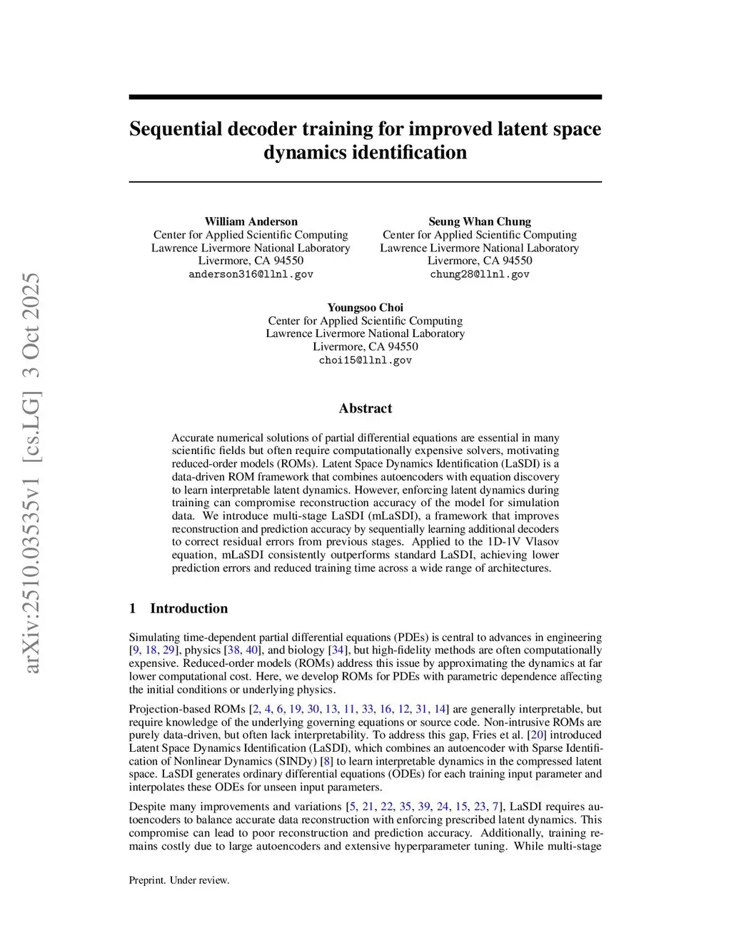 Accurate numerical solutions of partial differential equations are essential in many scientific fields but often require computationally expensive solvers, motivating reduced-order models (ROMs). Latent Space Dynamics Identification (LaSDI) is a data-driven ROM framework that combines autoencoders with equation discovery to learn interpretable latent dynamics. However, enforcing latent dynamics during training can compromise reconstruction accuracy of the model for simulation data. We introduce multi-stage LaSDI (mLaSDI), a framework that improves reconstruction and prediction accuracy by sequentially learning additional decoders to correct residual errors from previous stages. Applied to the 1D-1V Vlasov equation, mLaSDI consistently outperforms standard LaSDI, achieving lower prediction errors and reduced training time across a wide range of architectures.