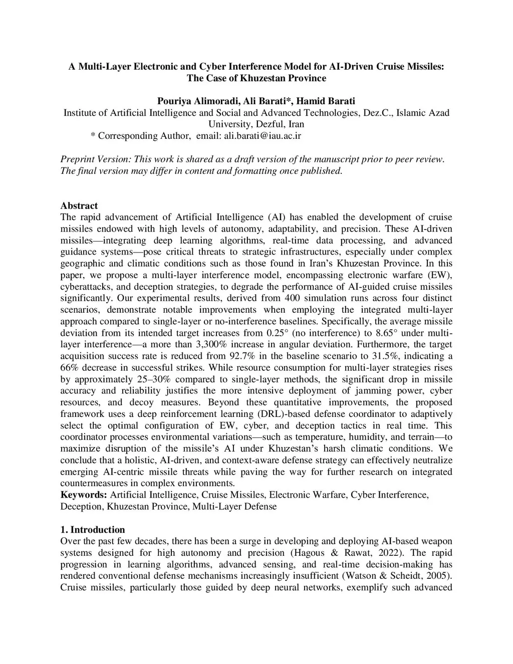 A Multi-Layer Electronic and Cyber Interference Model for AI-Driven Cruise Missiles: The Case of Khuzestan Province