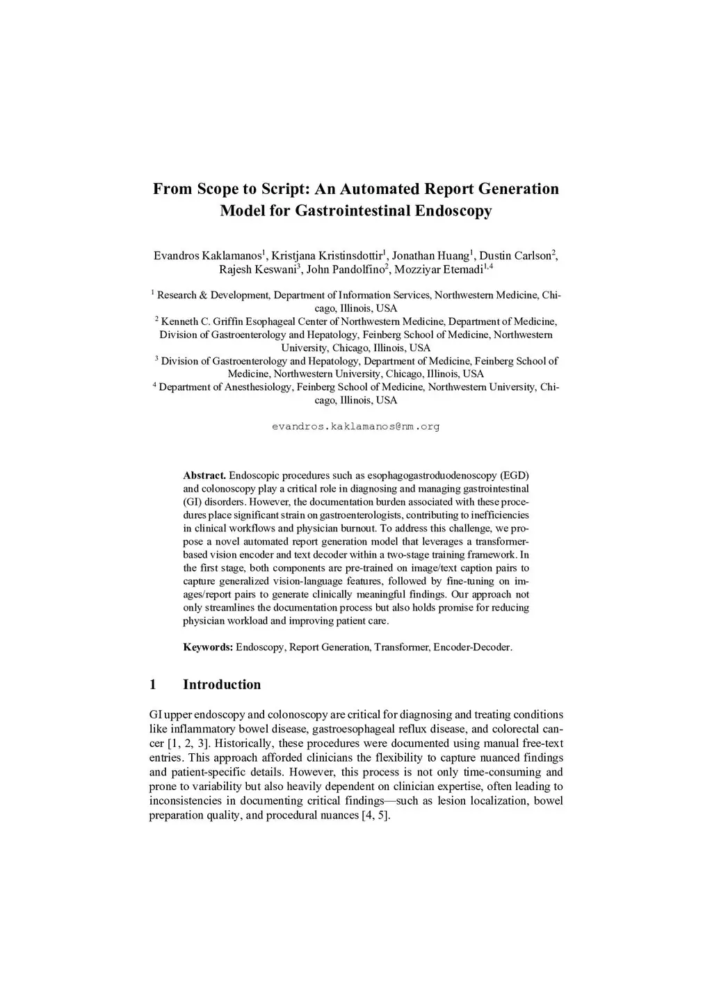 Endoscopic procedures such as esophagogastroduodenoscopy (EGD) and colonoscopy play a critical role in diagnosing and managing gastrointestinal (GI) disorders. However, the documentation burden associated with these procedures place significant strain on gastroenterologists, contributing to inefficiencies in clinical workflows and physician burnout. To address this challenge, we propose a novel automated report generation model that leverages a transformer-based vision encoder and text decoder within a two-stage training framework. In the first stage, both components are pre-trained on image/text caption pairs to capture generalized vision-language features, followed by fine-tuning on images/report pairs to generate clinically meaningful findings. Our approach not only streamlines the documentation process but also holds promise for reducing physician workload and improving patient care.