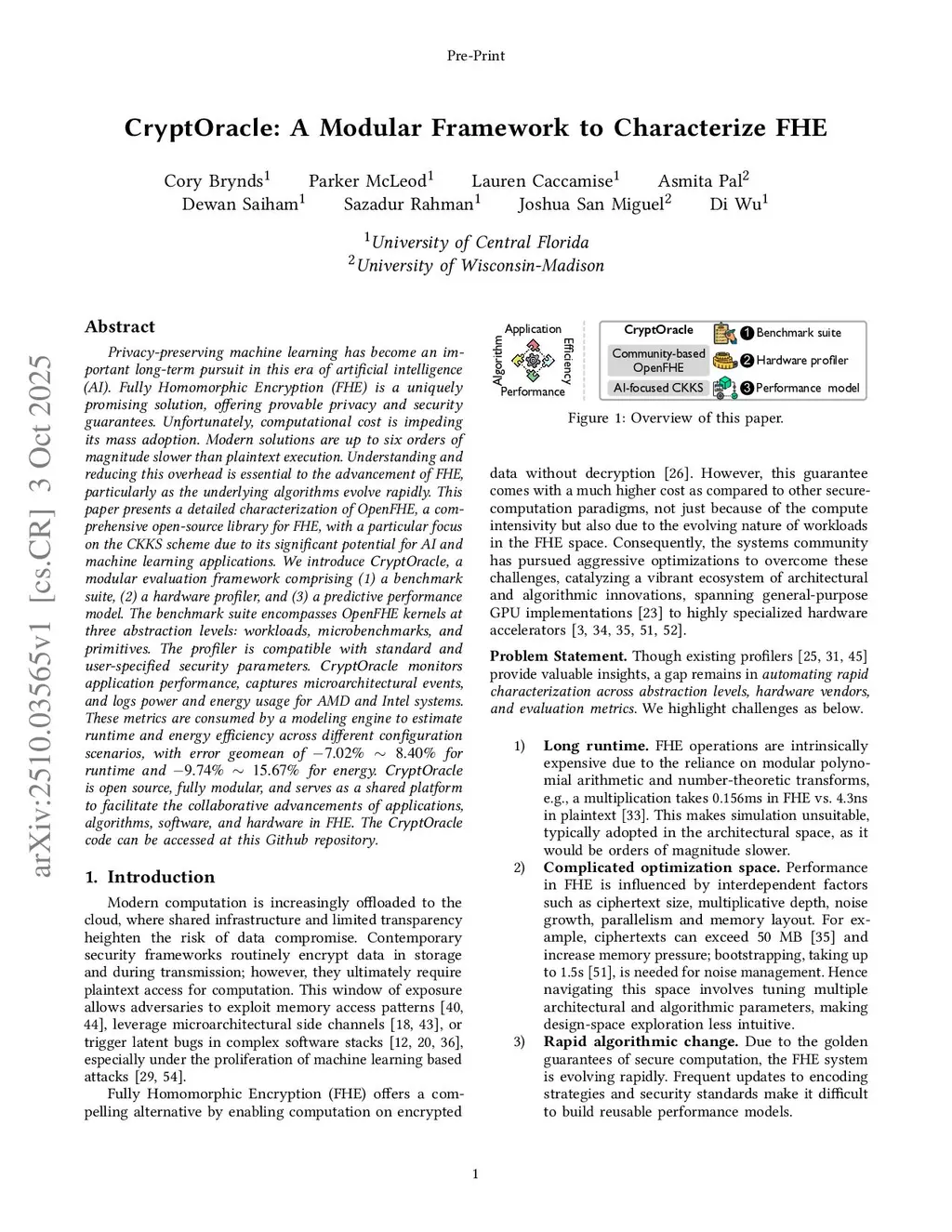 Privacy-preserving machine learning has become an important long-term pursuit in this era of artificial intelligence (AI). Fully Homomorphic Encryption (FHE) is a uniquely promising solution, offering provable privacy and security guarantees. Unfortunately, computational cost is impeding its mass adoption. Modern solutions are up to six orders of magnitude slower than plaintext execution. Understanding and reducing this overhead is essential to the advancement of FHE, particularly as the underlying algorithms evolve rapidly. This paper presents a detailed characterization of OpenFHE, a comprehensive open-source library for FHE, with a particular focus on the CKKS scheme due to its significant potential for AI and machine learning applications. We introduce CryptOracle, a modular evaluation framework comprising (1) a benchmark suite, (2) a hardware profiler, and (3) a predictive performance model. The benchmark suite encompasses OpenFHE kernels at three abstraction levels: workloads, microbenchmarks, and primitives. The profiler is compatible with standard and user-specified security parameters. CryptOracle monitors application performance, captures microarchitectural events, and logs power and energy usage for AMD and Intel systems. These metrics are consumed by a modeling engine to estimate runtime and energy efficiency across different configuration scenarios, with error geomean of for runtime and for energy. CryptOracle is open source, fully modular, and serves as a shared platform to facilitate the collaborative advancements of applications, algorithms, software, and hardware in FHE. The CryptOracle code can be accessed atthis https URL.