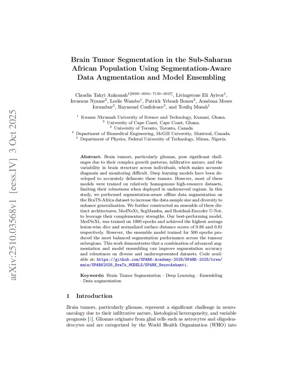 Brain tumors, particularly gliomas, pose significant chall-enges due to their complex growth patterns, infiltrative nature, and the variability in brain structure across individuals, which makes accurate diagnosis and monitoring difficult. Deep learning models have been developed to accurately delineate these tumors. However, most of these models were trained on relatively homogenous high-resource datasets, limiting their robustness when deployed in underserved regions. In this study, we performed segmentation-aware offline data augmentation on the BraTS-Africa dataset to increase the data sample size and diversity to enhance generalization. We further constructed an ensemble of three distinct architectures, MedNeXt, SegMamba, and Residual-Encoder U-Net, to leverage their complementary strengths. Our best-performing model, MedNeXt, was trained on 1000 epochs and achieved the highest average lesion-wise dice and normalized surface distance scores of 0.86 and 0.81 respectively. However, the ensemble model trained for 500 epochs produced the most balanced segmentation performance across the tumour subregions. This work demonstrates that a combination of advanced augmentation and model ensembling can improve segmentation accuracy and robustness on diverse and underrepresented datasets. Code available at:this https URL