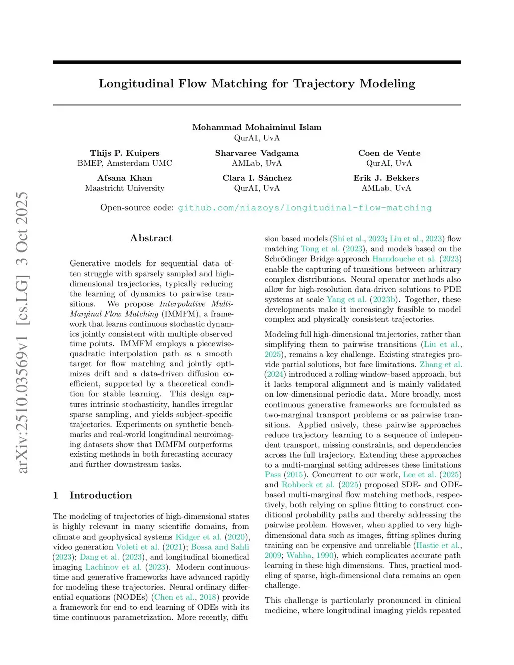 Generative models for sequential data often struggle with sparsely sampled and high-dimensional trajectories, typically reducing the learning of dynamics to pairwise transitions. We propose Interpolative Multi-Marginal Flow Matching (IMMFM), a framework that learns continuous stochastic dynamics jointly consistent with multiple observed time points. IMMFM employs a piecewise-quadratic interpolation path as a smooth target for flow matching and jointly optimizes drift and a data-driven diffusion coefficient, supported by a theoretical condition for stable learning. This design captures intrinsic stochasticity, handles irregular sparse sampling, and yields subject-specific trajectories. Experiments on synthetic benchmarks and real-world longitudinal neuroimaging datasets show that IMMFM outperforms existing methods in both forecasting accuracy and further downstream tasks.