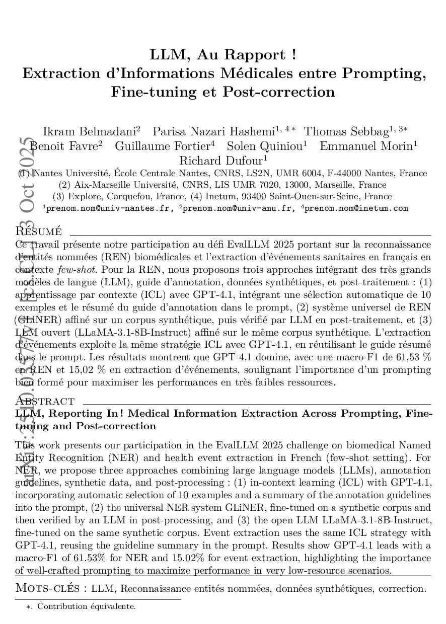 This work presents our participation in the EvalLLM 2025 challenge on biomedical Named Entity Recognition (NER) and health event extraction in French (few-shot setting). For NER, we propose three approaches combining large language models (LLMs), annotation guidelines, synthetic data, and post-processing: (1) in-context learning (ICL) with GPT-4.1, incorporating automatic selection of 10 examples and a summary of the annotation guidelines into the prompt, (2) the universal NER system GLiNER, fine-tuned on a synthetic corpus and then verified by an LLM in post-processing, and (3) the open LLM LLaMA-3.1-8B-Instruct, fine-tuned on the same synthetic corpus. Event extraction uses the same ICL strategy with GPT-4.1, reusing the guideline summary in the prompt. Results show GPT-4.1 leads with a macro-F1 of 61.53% for NER and 15.02% for event extraction, highlighting the importance of well-crafted prompting to maximize performance in very low-resource scenarios.
