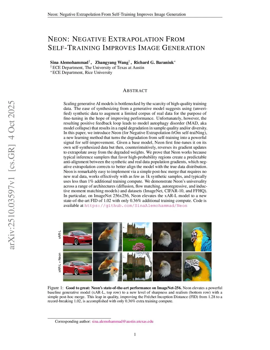 Scaling generative AI models is bottlenecked by the scarcity of high-quality training data. The ease of synthesizing from a generative model suggests using (unverified) synthetic data to augment a limited corpus of real data for the purpose of fine-tuning in the hope of improving performance. Unfortunately, however, the resulting positive feedback loop leads to model autophagy disorder (MAD, aka model collapse) that results in a rapid degradation in sample quality and/or diversity. In this paper, we introduce Neon (for Negative Extrapolation frOm self-traiNing), a new learning method that turns the degradation from self-training into a powerful signal for self-improvement. Given a base model, Neon first fine-tunes it on its own self-synthesized data but then, counterintuitively, reverses its gradient updates to extrapolate away from the degraded weights. We prove that Neon works because typical inference samplers that favor high-probability regions create a predictable anti-alignment between the synthetic and real data population gradients, which negative extrapolation corrects to better align the model with the true data distribution. Neon is remarkably easy to implement via a simple post-hoc merge that requires no new real data, works effectively with as few as 1k synthetic samples, and typically uses less than 1% additional training compute. We demonstrate Neon's universality across a range of architectures (diffusion, flow matching, autoregressive, and inductive moment matching models) and datasets (ImageNet, CIFAR-10, and FFHQ). In particular, on ImageNet 256x256, Neon elevates the xAR-L model to a new state-of-the-art FID of 1.02 with only 0.36% additional training compute. Code is available atthis https URL