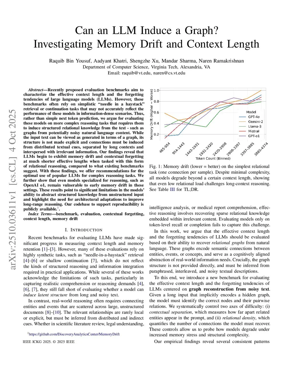 Recently proposed evaluation benchmarks aim to characterize the effective context length and the forgetting tendencies of large language models (LLMs). However, these benchmarks often rely on simplistic ñeedle in a haystack' retrieval or continuation tasks that may not accurately reflect the performance of these models in information-dense scenarios. Thus, rather than simple next token prediction, we argue for evaluating these models on more complex reasoning tasks that requires them to induce structured relational knowledge from the text - such as graphs from potentially noisy natural language content. While the input text can be viewed as generated in terms of a graph, its structure is not made explicit and connections must be induced from distributed textual cues, separated by long contexts and interspersed with irrelevant information. Our findings reveal that LLMs begin to exhibit memory drift and contextual forgetting at much shorter effective lengths when tasked with this form of relational reasoning, compared to what existing benchmarks suggest. With these findings, we offer recommendations for the optimal use of popular LLMs for complex reasoning tasks. We further show that even models specialized for reasoning, such as OpenAI o1, remain vulnerable to early memory drift in these settings. These results point to significant limitations in the models' ability to abstract structured knowledge from unstructured input and highlight the need for architectural adaptations to improve long-range reasoning.