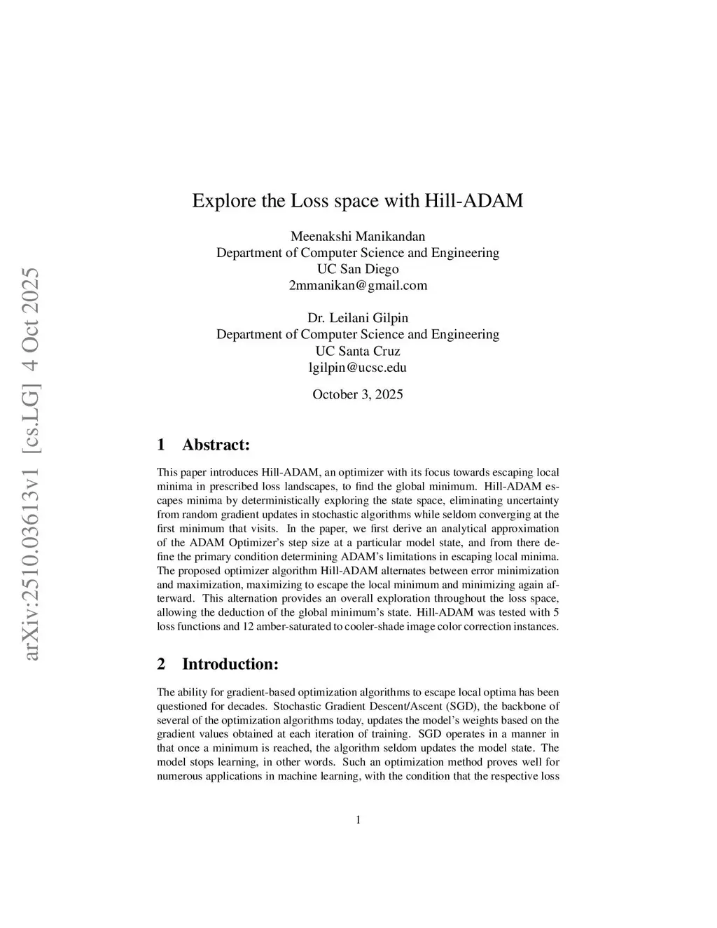 This paper introduces Hill-ADAM. Hill-ADAM is an optimizer with its focus towards escaping local minima in prescribed loss landscapes to find the global minimum. Hill-ADAM escapes minima by deterministically exploring the state space. This eliminates uncertainty from random gradient updates in stochastic algorithms while seldom converging at the first minimum that visits. In the paper we first derive an analytical approximation of the ADAM Optimizer step size at a particular model state. From there define the primary condition determining ADAM limitations in escaping local minima. The proposed optimizer algorithm Hill-ADAM alternates between error minimization and maximization. It maximizes to escape the local minimum and minimizes again afterward. This alternation provides an overall exploration throughout the loss space. This allows the deduction of the global minimum's state. Hill-ADAM was tested with 5 loss functions and 12 amber-saturated to cooler-shade image color correction instances.
