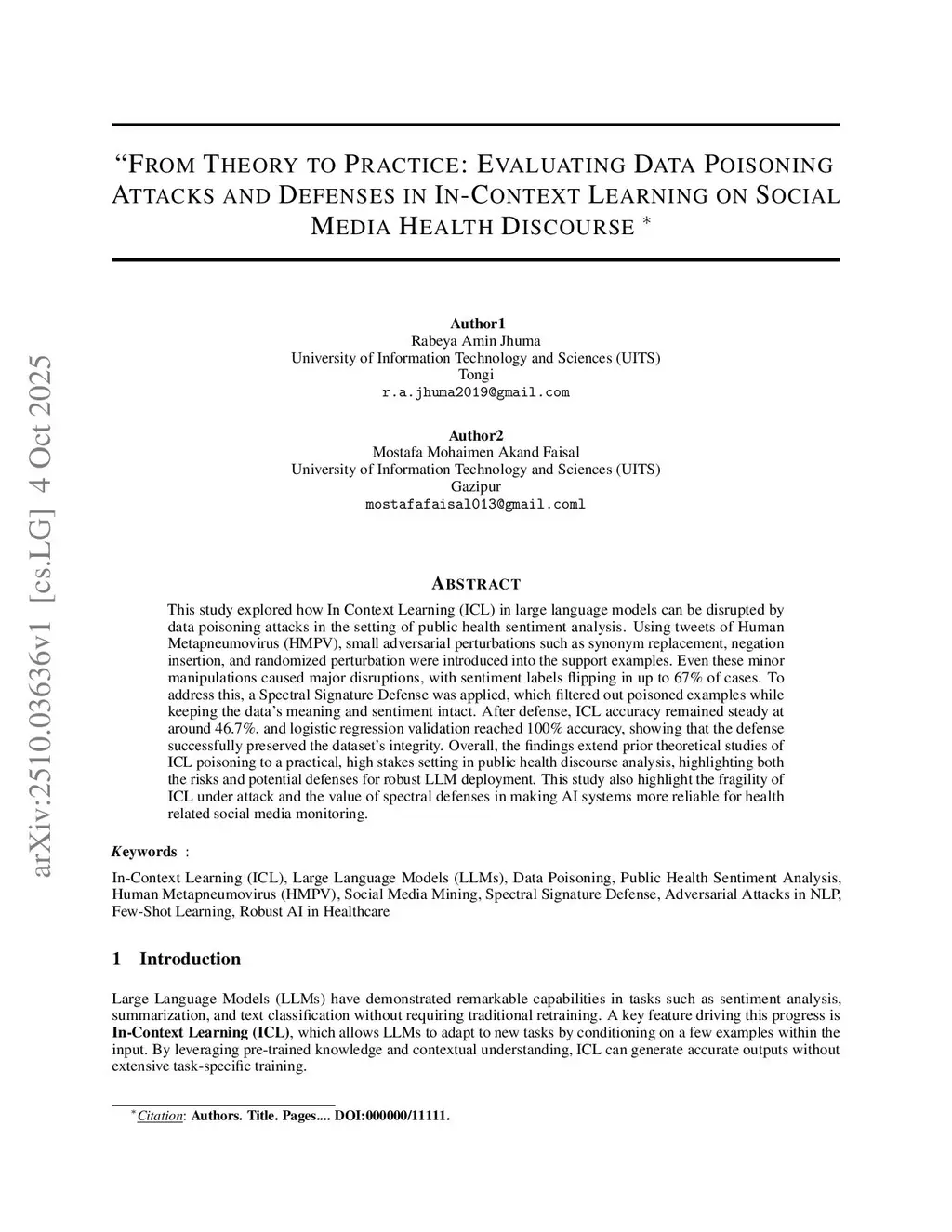 This study explored how in-context learning (ICL) in large language models can be disrupted by data poisoning attacks in the setting of public health sentiment analysis. Using tweets of Human Metapneumovirus (HMPV), small adversarial perturbations such as synonym replacement, negation insertion, and randomized perturbation were introduced into the support examples. Even these minor manipulations caused major disruptions, with sentiment labels flipping in up to 67% of cases. To address this, a Spectral Signature Defense was applied, which filtered out poisoned examples while keeping the data's meaning and sentiment intact. After defense, ICL accuracy remained steady at around 46.7%, and logistic regression validation reached 100% accuracy, showing that the defense successfully preserved the dataset's integrity. Overall, the findings extend prior theoretical studies of ICL poisoning to a practical, high-stakes setting in public health discourse analysis, highlighting both the risks and potential defenses for robust LLM deployment. This study also highlights the fragility of ICL under attack and the value of spectral defenses in making AI systems more reliable for health-related social media monitoring.