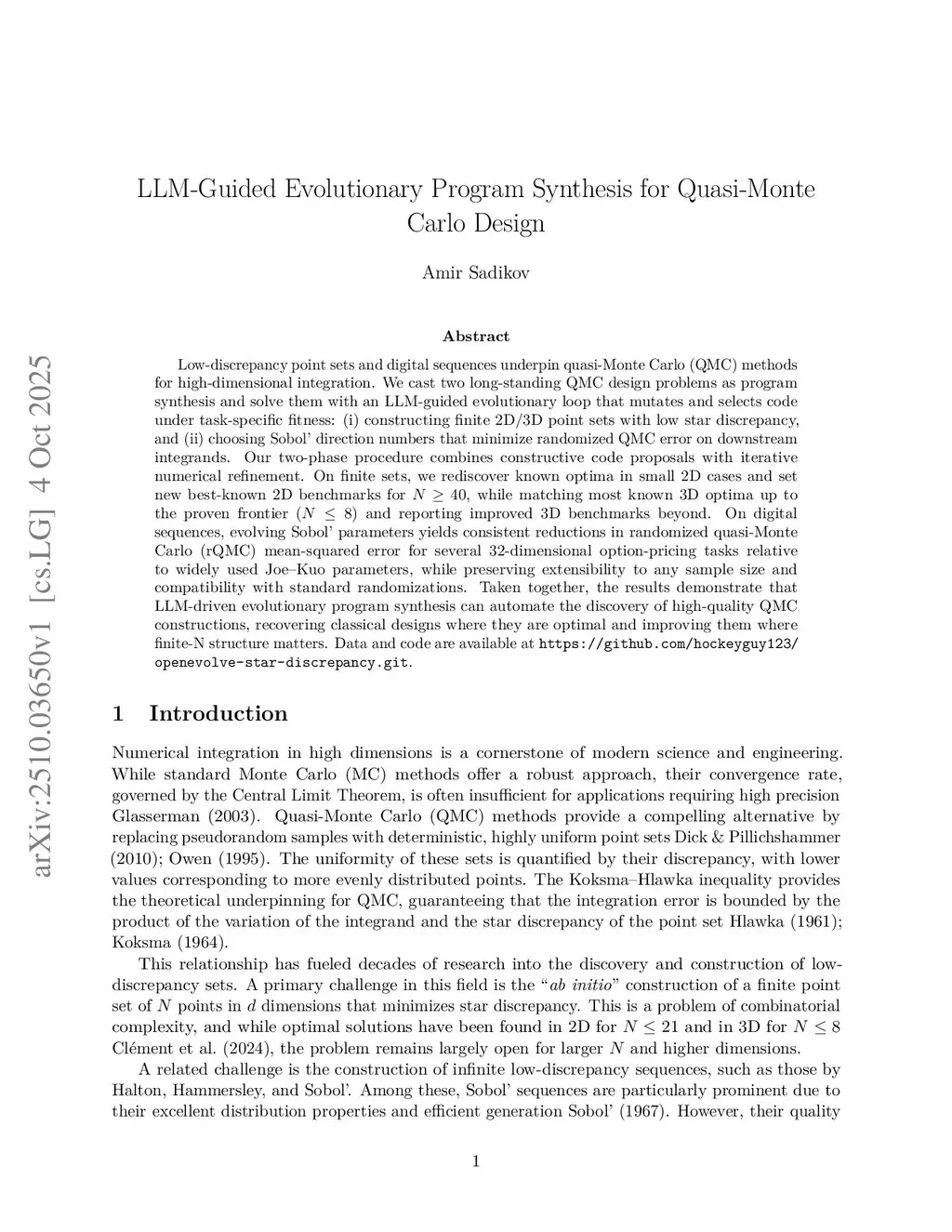 Low-discrepancy point sets and digital sequences underpin quasi-Monte Carlo (QMC) methods for high-dimensional integration. We cast two long-standing QMC design problems as program synthesis and solve them with an LLM-guided evolutionary loop that mutates and selects code under task-specific fitness: (i) constructing finite 2D/3D point sets with low star discrepancy, and (ii) choosing Sobol' direction numbers that minimize randomized QMC error on downstream integrands. Our two-phase procedure combines constructive code proposals with iterative numerical refinement. On finite sets, we rediscover known optima in small 2D cases and set new best-known 2D benchmarks for N >= 40, while matching most known 3D optima up to the proven frontier (N <= 8) and reporting improved 3D benchmarks beyond. On digital sequences, evolving Sobol' parameters yields consistent reductions in randomized quasi-Monte Carlo (rQMC) mean-squared error for several 32-dimensional option-pricing tasks relative to widely used Joe--Kuo parameters, while preserving extensibility to any sample size and compatibility with standard randomizations. Taken together, the results demonstrate that LLM-driven evolutionary program synthesis can automate the discovery of high-quality QMC constructions, recovering classical designs where they are optimal and improving them where finite-N structure matters. Data and code are available atthis https URL.