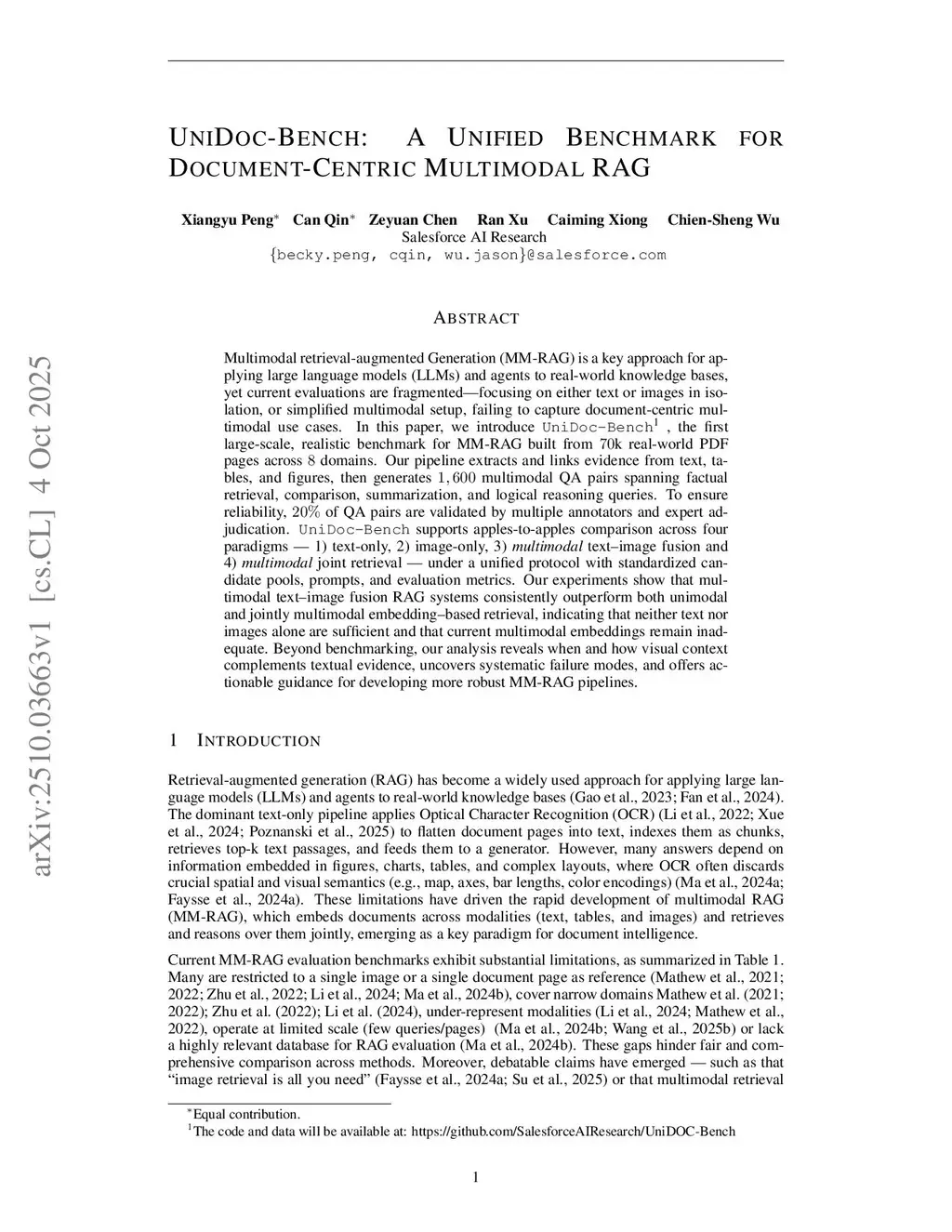 UNIDOC-BENCH: A Unified Benchmark for Document-Centric Multimodal RAG