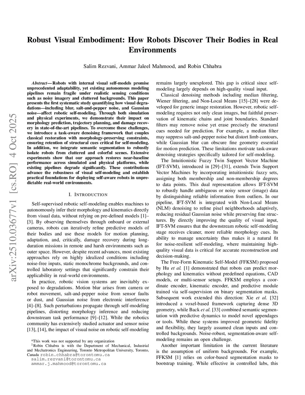 Robots with internal visual self-models promise unprecedented adaptability, yet existing autonomous modeling pipelines remain fragile under realistic sensing conditions such as noisy imagery and cluttered backgrounds. This paper presents the first systematic study quantifying how visual degradations--including blur, salt-and-pepper noise, and Gaussian noise--affect robotic self-modeling. Through both simulation and physical experiments, we demonstrate their impact on morphology prediction, trajectory planning, and damage recovery in state-of-the-art pipelines. To overcome these challenges, we introduce a task-aware denoising framework that couples classical restoration with morphology-preserving constraints, ensuring retention of structural cues critical for self-modeling. In addition, we integrate semantic segmentation to robustly isolate robots from cluttered and colorful scenes. Extensive experiments show that our approach restores near-baseline performance across simulated and physical platforms, while existing pipelines degrade significantly. These contributions advance the robustness of visual self-modeling and establish practical foundations for deploying self-aware robots in unpredictable real-world environments.