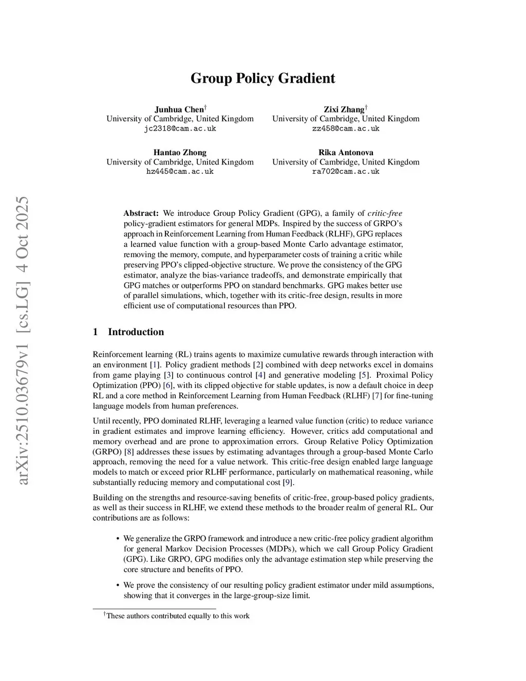 We introduce Group Policy Gradient (GPG), a family of critic-free policy-gradient estimators for general MDPs. Inspired by the success of GRPO's approach in Reinforcement Learning from Human Feedback (RLHF), GPG replaces a learned value function with a group-based Monte Carlo advantage estimator, removing the memory, compute, and hyperparameter costs of training a critic while preserving PPO's clipped-objective structure. We prove the consistency of the GPG estimator, analyze the bias-variance tradeoffs, and demonstrate empirically that GPG matches or outperforms PPO on standard benchmarks. GPG makes better use of parallel simulations, which, together with its critic-free design, results in more efficient use of computational resources than PPO.
