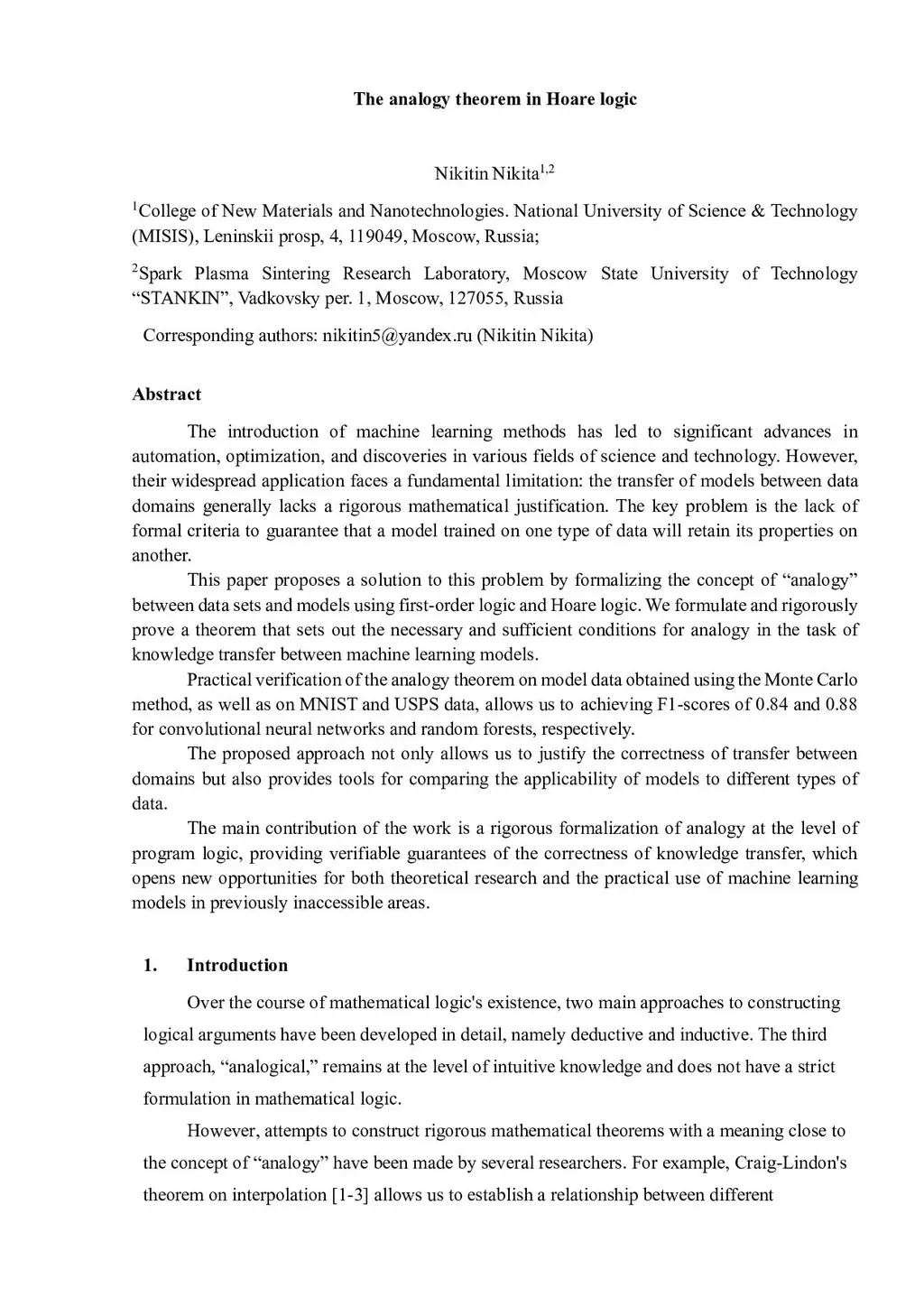 The introduction of machine learning methods has led to significant advances in automation, optimization, and discoveries in various fields of science and technology. However, their widespread application faces a fundamental limitation: the transfer of models between data domains generally lacks a rigorous mathematical justification. The key problem is the lack of formal criteria to guarantee that a model trained on one type of data will retain its properties onthis http URLpaper proposes a solution to this problem by formalizing the concept of analogy between data sets and models using first-order logic and Hoarethis http URLformulate and rigorously prove a theorem that sets out the necessary and sufficient conditions for analogy in the task of knowledge transfer between machine learning models. Practical verification of the analogy theorem on model data obtained using the Monte Carlo method, as well as on MNIST and USPS data, allows us to achieving F1 scores of 0.84 and 0.88 for convolutional neural networks and random forests,this http URLproposed approach not only allows us to justify the correctness of transfer between domains but also provides tools for comparing the applicability of models to different types ofthis http URLmain contribution of the work is a rigorous formalization of analogy at the level of program logic, providing verifiable guarantees of the correctness of knowledge transfer, which opens new opportunities for both theoretical research and the practical use of machine learning models in previously inaccessible areas.