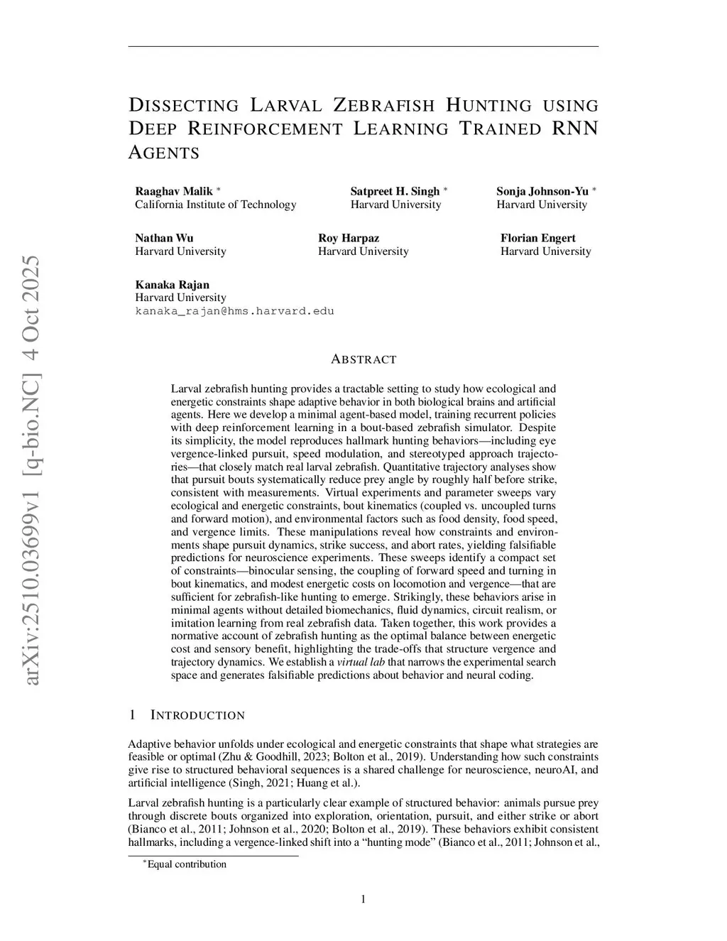 Larval zebrafish hunting provides a tractable setting to study how ecological and energetic constraints shape adaptive behavior in both biological brains and artificial agents. Here we develop a minimal agent-based model, training recurrent policies with deep reinforcement learning in a bout-based zebrafish simulator. Despite its simplicity, the model reproduces hallmark hunting behaviors -- including eye vergence-linked pursuit, speed modulation, and stereotyped approach trajectories -- that closely match real larval zebrafish. Quantitative trajectory analyses show that pursuit bouts systematically reduce prey angle by roughly half before strike, consistent with measurements. Virtual experiments and parameter sweeps vary ecological and energetic constraints, bout kinematics (coupled vs. uncoupled turns and forward motion), and environmental factors such as food density, food speed, and vergence limits. These manipulations reveal how constraints and environments shape pursuit dynamics, strike success, and abort rates, yielding falsifiable predictions for neuroscience experiments. These sweeps identify a compact set of constraints -- binocular sensing, the coupling of forward speed and turning in bout kinematics, and modest energetic costs on locomotion and vergence -- that are sufficient for zebrafish-like hunting to emerge. Strikingly, these behaviors arise in minimal agents without detailed biomechanics, fluid dynamics, circuit realism, or imitation learning from real zebrafish data. Taken together, this work provides a normative account of zebrafish hunting as the optimal balance between energetic cost and sensory benefit, highlighting the trade-offs that structure vergence and trajectory dynamics. We establish a virtual lab that narrows the experimental search space and generates falsifiable predictions about behavior and neural coding.