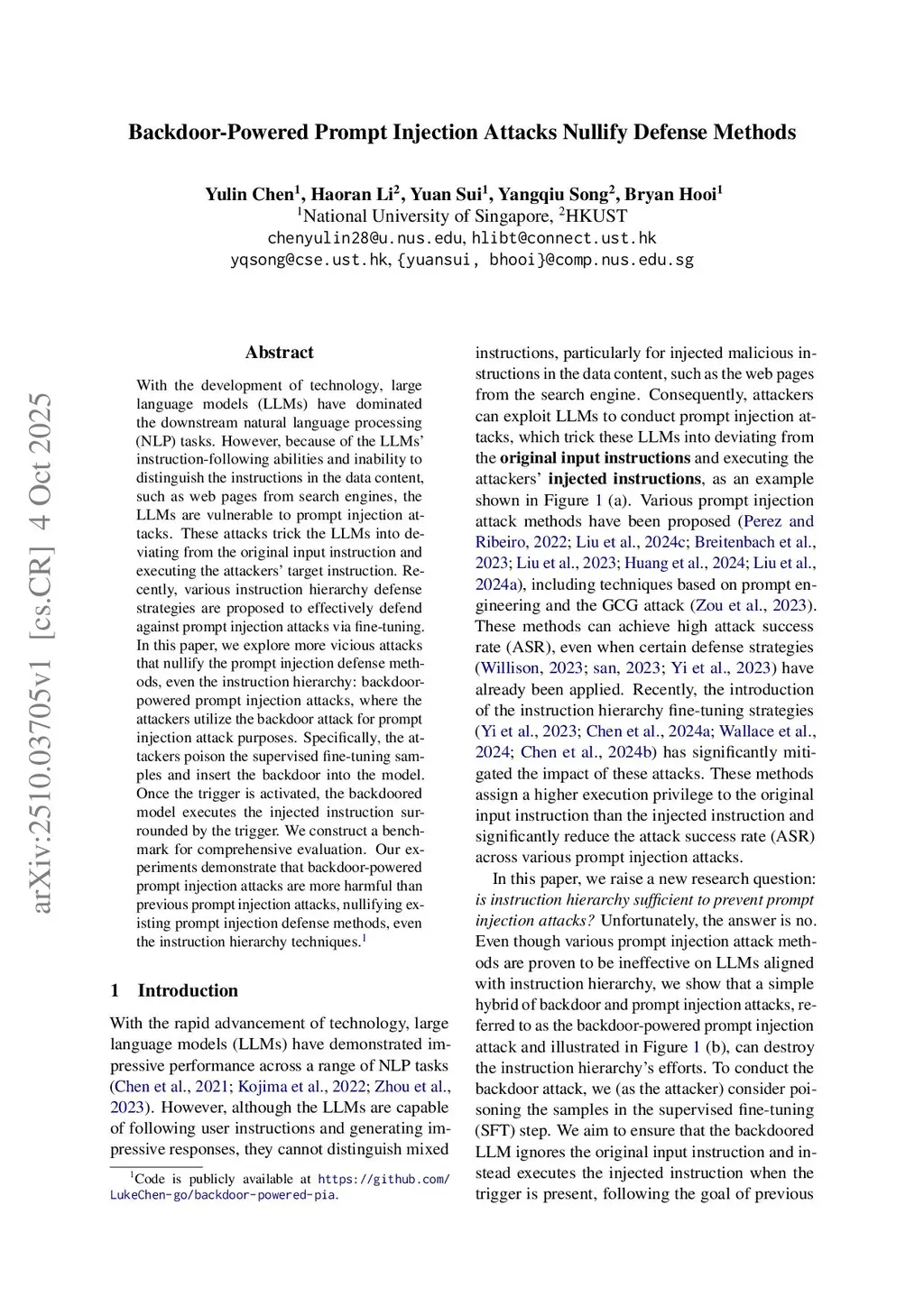 Backdoor-Powered Prompt Injection Attacks Nullify Defense Methods