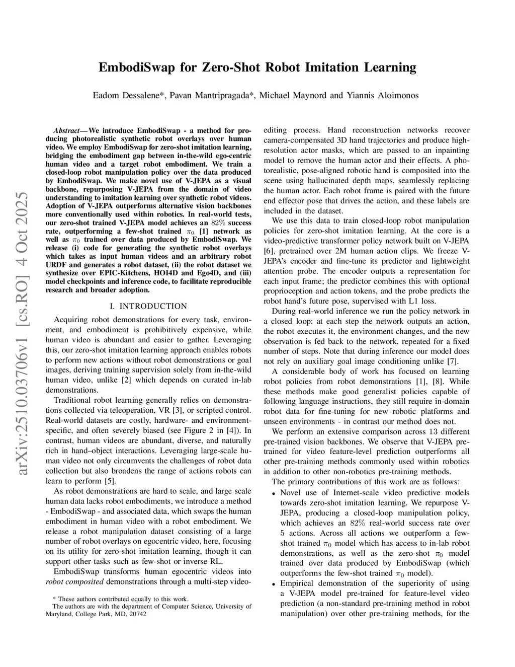 We introduce EmbodiSwap - a method for producing photorealistic synthetic robot overlays over human video. We employ EmbodiSwap for zero-shot imitation learning, bridging the embodiment gap between in-the-wild ego-centric human video and a target robot embodiment. We train a closed-loop robot manipulation policy over the data produced by EmbodiSwap. We make novel use of V-JEPA as a visual backbone, repurposing V-JEPA from the domain of video understanding to imitation learning over synthetic robot videos. Adoption of V-JEPA outperforms alternative vision backbones more conventionally used within robotics. In real-world tests, our zero-shot trained V-JEPA model achieves an success rate, outperforming a few-shot trained network as well as trained over data produced by EmbodiSwap. We release (i) code for generating the synthetic robot overlays which takes as input human videos and an arbitrary robot URDF and generates a robot dataset, (ii) the robot dataset we synthesize over EPIC-Kitchens, HOI4D and Ego4D, and (iii) model checkpoints and inference code, to facilitate reproducible research and broader adoption.
