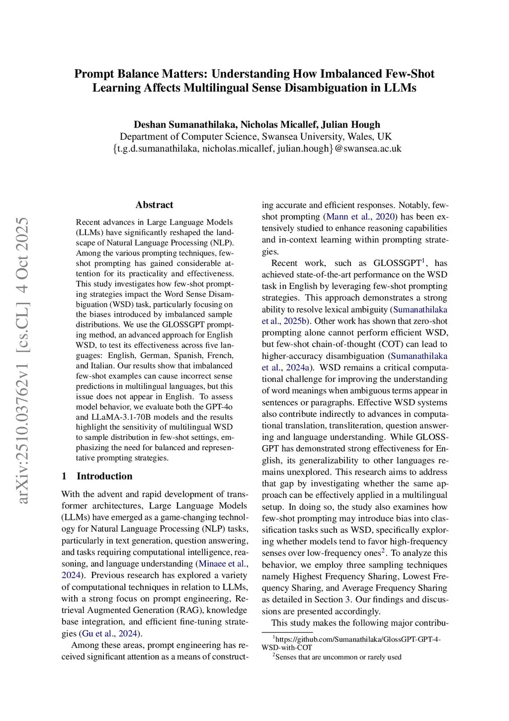 Recent advances in Large Language Models (LLMs) have significantly reshaped the landscape of Natural Language Processing (NLP). Among the various prompting techniques, few-shot prompting has gained considerable attention for its practicality and effectiveness. This study investigates how few-shot prompting strategies impact the Word Sense Disambiguation (WSD) task, particularly focusing on the biases introduced by imbalanced sample distributions. We use the GLOSSGPT prompting method, an advanced approach for English WSD, to test its effectiveness across five languages: English, German, Spanish, French, and Italian. Our results show that imbalanced few-shot examples can cause incorrect sense predictions in multilingual languages, but this issue does not appear in English. To assess model behavior, we evaluate both the GPT-4o and LLaMA-3.1-70B models and the results highlight the sensitivity of multilingual WSD to sample distribution in few-shot settings, emphasizing the need for balanced and representative prompting strategies.