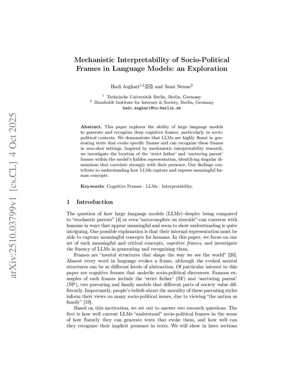 This paper explores the ability of large language models to generate and recognize deep cognitive frames, particularly in socio-political contexts. We demonstrate that LLMs are highly fluent in generating texts that evoke specific frames and can recognize these frames in zero-shot settings. Inspired by mechanistic interpretability research, we investigate the location of the `strict father' and `nurturing parent' frames within the model's hidden representation, identifying singular dimensions that correlate strongly with their presence. Our findings contribute to understanding how LLMs capture and express meaningful human concepts.