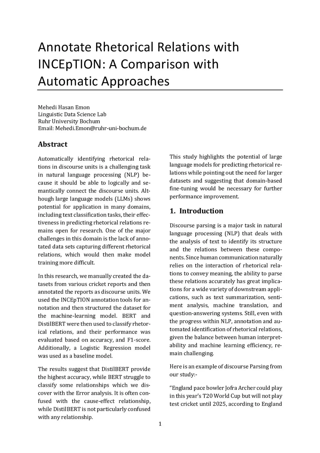 This research explores the annotation of rhetorical relations in discourse using the INCEpTION tool and compares manual annotation with automatic approaches based on large language models. The study focuses on sports reports (specifically cricket news) and evaluates the performance of BERT, DistilBERT, and Logistic Regression models in classifying rhetorical relations such as elaboration, contrast, background, and cause-effect. The results show that DistilBERT achieved the highest accuracy, highlighting its potential for efficient discourse relation prediction. This work contributes to the growing intersection of discourse parsing and transformer-based NLP. (This paper was conducted as part of an academic requirement under the supervision of Prof. Dr. Ralf Klabunde, Linguistic Data Science Lab, Ruhr University Bochum.) Keywords: Rhetorical Structure Theory, INCEpTION, BERT, DistilBERT, Discourse Parsing, NLP.
