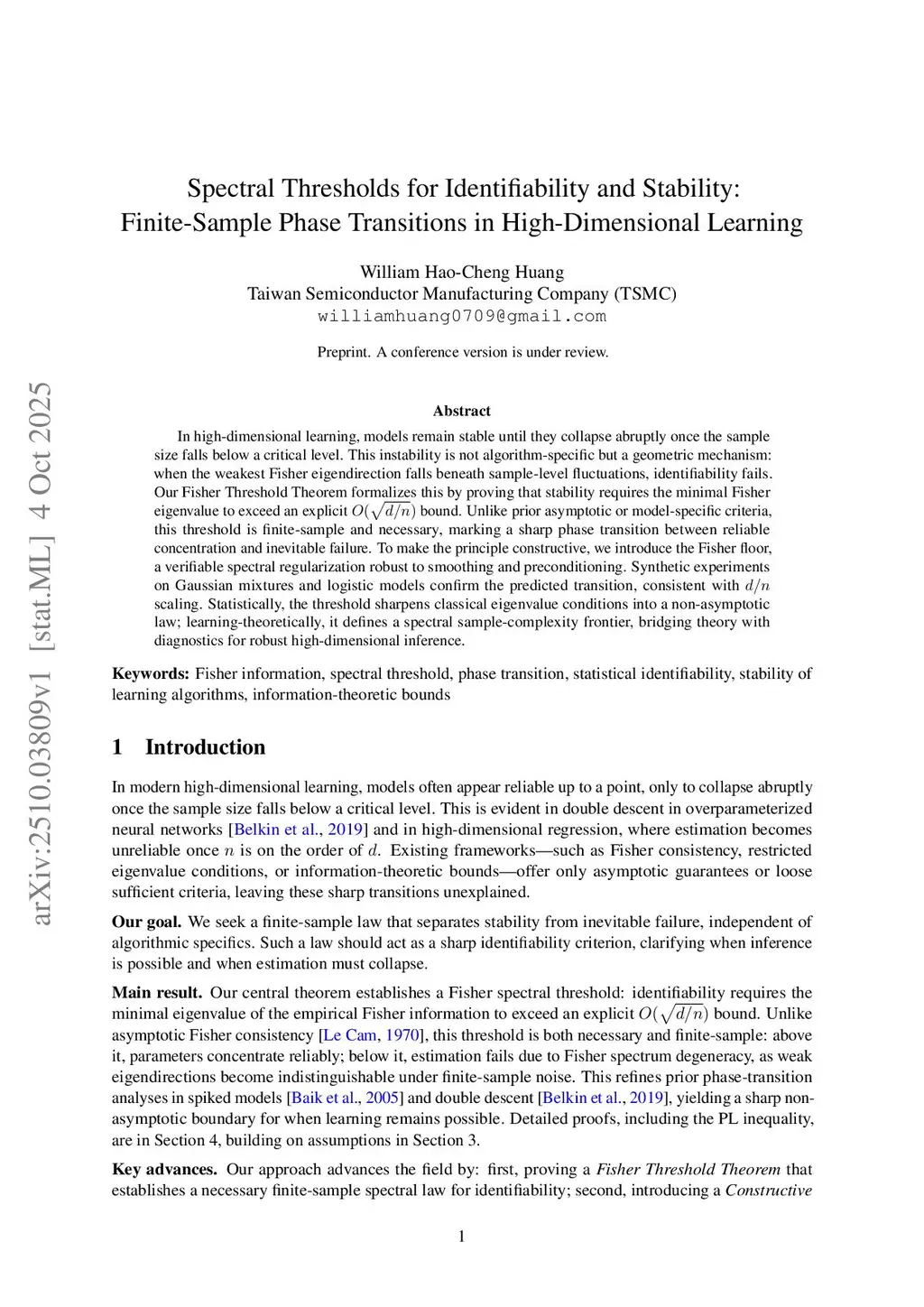 In high-dimensional learning, models remain stable until they collapse abruptly once the sample size falls below a critical level. This instability is not algorithm-specific but a geometric mechanism: when the weakest Fisher eigendirection falls beneath sample-level fluctuations, identifiability fails. Our Fisher Threshold Theorem formalizes this by proving that stability requires the minimal Fisher eigenvalue to exceed an explicit bound. Unlike prior asymptotic or model-specific criteria, this threshold is finite-sample and necessary, marking a sharp phase transition between reliable concentration and inevitable failure. To make the principle constructive, we introduce the Fisher floor, a verifiable spectral regularization robust to smoothing and preconditioning. Synthetic experiments on Gaussian mixtures and logistic models confirm the predicted transition, consistent with scaling. Statistically, the threshold sharpens classical eigenvalue conditions into a non-asymptotic law; learning-theoretically, it defines a spectral sample-complexity frontier, bridging theory with diagnostics for robust high-dimensional inference.