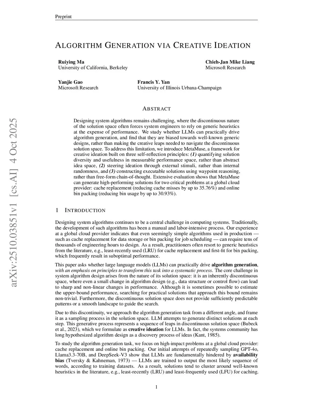 Designing system algorithms remains challenging, where the discontinuous nature of the solution space often forces system engineers to rely on generic heuristics at the expense of performance. We study whether LLMs can practically drive algorithm generation, and find that they are biased towards well-known generic designs, rather than making the creative leaps needed to navigate the discontinuous solution space. To address this limitation, we introduce MetaMuse, a framework for creative ideation built on three self-reflection principles: (1) quantifying solution diversity and usefulness in measurable performance space, rather than abstract idea space, (2) steering ideation through external stimuli, rather than internal randomness, and (3) constructing executable solutions using waypoint reasoning, rather than free-form chain-of-thought. Extensive evaluation shows that MetaMuse can generate high-performing solutions for two critical problems at a global cloud provider: cache replacement (reducing cache misses by up to 35.76%) and online bin packing (reducing bin usage by up to 30.93%).