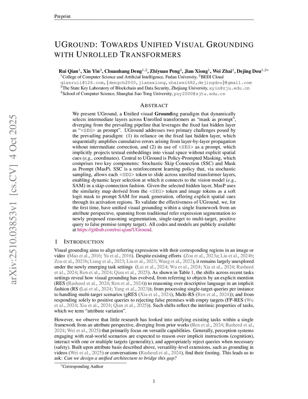 We present UGround, a \textbf{U}nified visual \textbf{Ground}ing paradigm that dynamically selects intermediate layers across \textbf{U}nrolled transformers as ``mask as prompt'', diverging from the prevailing pipeline that leverages the fixed last hidden layer as ``\texttt{<SEG>} as prompt''. UGround addresses two primary challenges posed by the prevailing paradigm: (1) its reliance on the fixed last hidden layer, which sequentially amplifies cumulative errors arising from layer-by-layer propagation without intermediate correction, and (2) its use of \texttt{<SEG>} as a prompt, which implicitly projects textual embeddings into visual space without explicit spatial cues (\eg, coordinates). Central to UGround is Policy-Prompted Masking, which comprises two key components: Stochastic Skip Connection (SSC) and Mask as Prompt (MasP). SSC is a reinforcement learning policy that, via stochastic sampling, allows each \texttt{<SEG>} token to slide across unrolled transformer layers, enabling dynamic layer selection at which it connects to the vision model (\eg, SAM) in a skip-connection fashion. Given the selected hidden layer, MasP uses the similarity map derived from the \texttt{<SEG>} token and image tokens as a soft logit mask to prompt SAM for mask generation, offering explicit spatial cues through its activation regions. To validate the effectiveness of UGround, we, for the first time, have unified visual grounding within a single framework from an attribute perspective, spanning from traditional refer expression segmentation to newly proposed reasoning segmentation, single-target to multi-target, positive query to false premise (empty target). All codes and models are publicly available at \href{this https URL}{this https URL}.