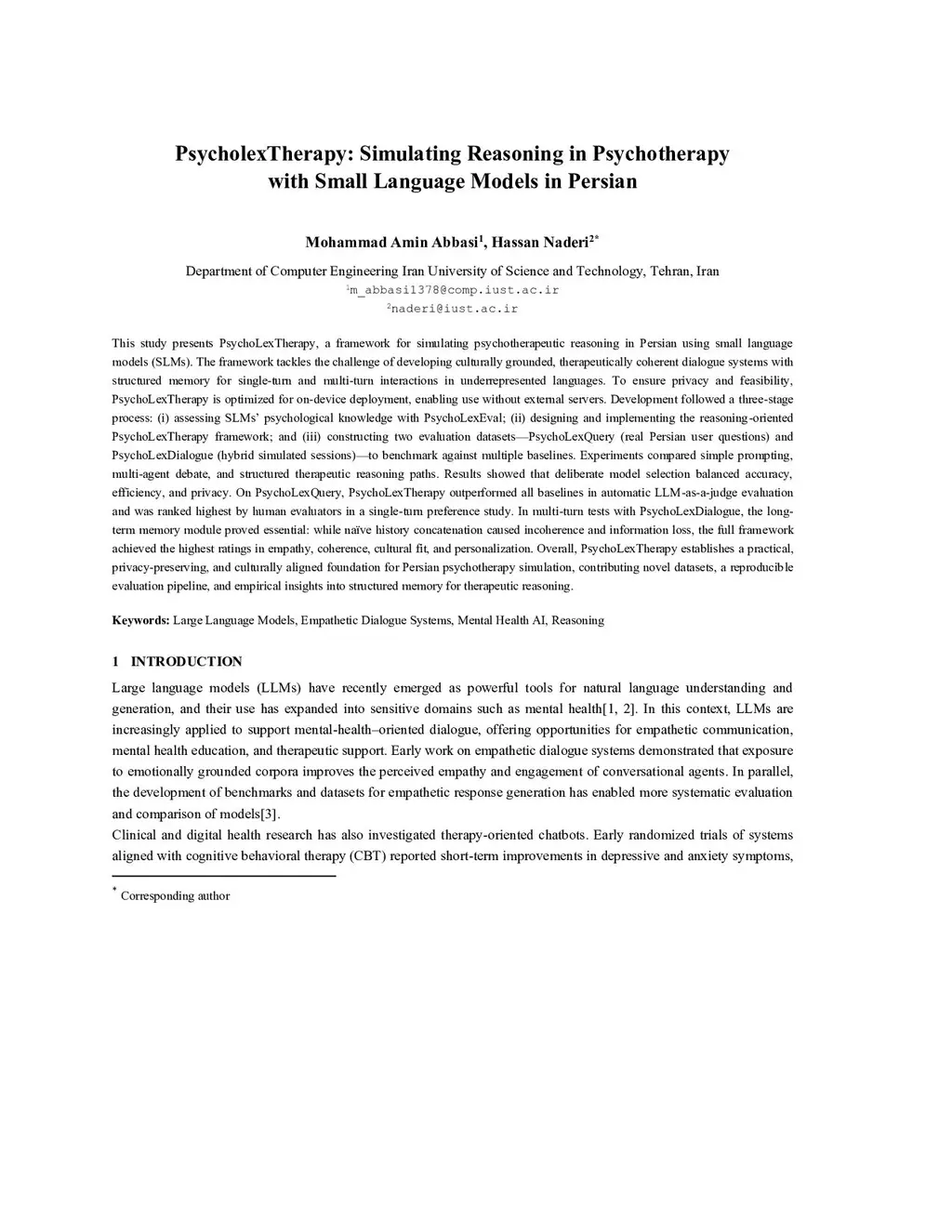 This study presents PsychoLexTherapy, a framework for simulating psychotherapeutic reasoning in Persian using small language models (SLMs). The framework tackles the challenge of developing culturally grounded, therapeutically coherent dialogue systems with structured memory for multi-turn interactions in underrepresented languages. To ensure privacy and feasibility, PsychoLexTherapy is optimized for on-device deployment, enabling use without external servers. Development followed a three-stage process: (i) assessing SLMs psychological knowledge with PsychoLexEval; (ii) designing and implementing the reasoning-oriented PsychoLexTherapy framework; and (iii) constructing two evaluation datasets-PsychoLexQuery (real Persian user questions) and PsychoLexDialogue (hybrid simulated sessions)-to benchmark against multiple baselines. Experiments compared simple prompting, multi-agent debate, and structured therapeutic reasoning paths. Results showed that deliberate model selection balanced accuracy, efficiency, and privacy. On PsychoLexQuery, PsychoLexTherapy outperformed all baselines in automatic LLM-as-a-judge evaluation and was ranked highest by human evaluators in a single-turn preference study. In multi-turn tests with PsychoLexDialogue, the long-term memory module proved essential: while naive history concatenation caused incoherence and information loss, the full framework achieved the highest ratings in empathy, coherence, cultural fit, and personalization. Overall, PsychoLexTherapy establishes a practical, privacy-preserving, and culturally aligned foundation for Persian psychotherapy simulation, contributing novel datasets, a reproducible evaluation pipeline, and empirical insights into structured memory for therapeutic reasoning.