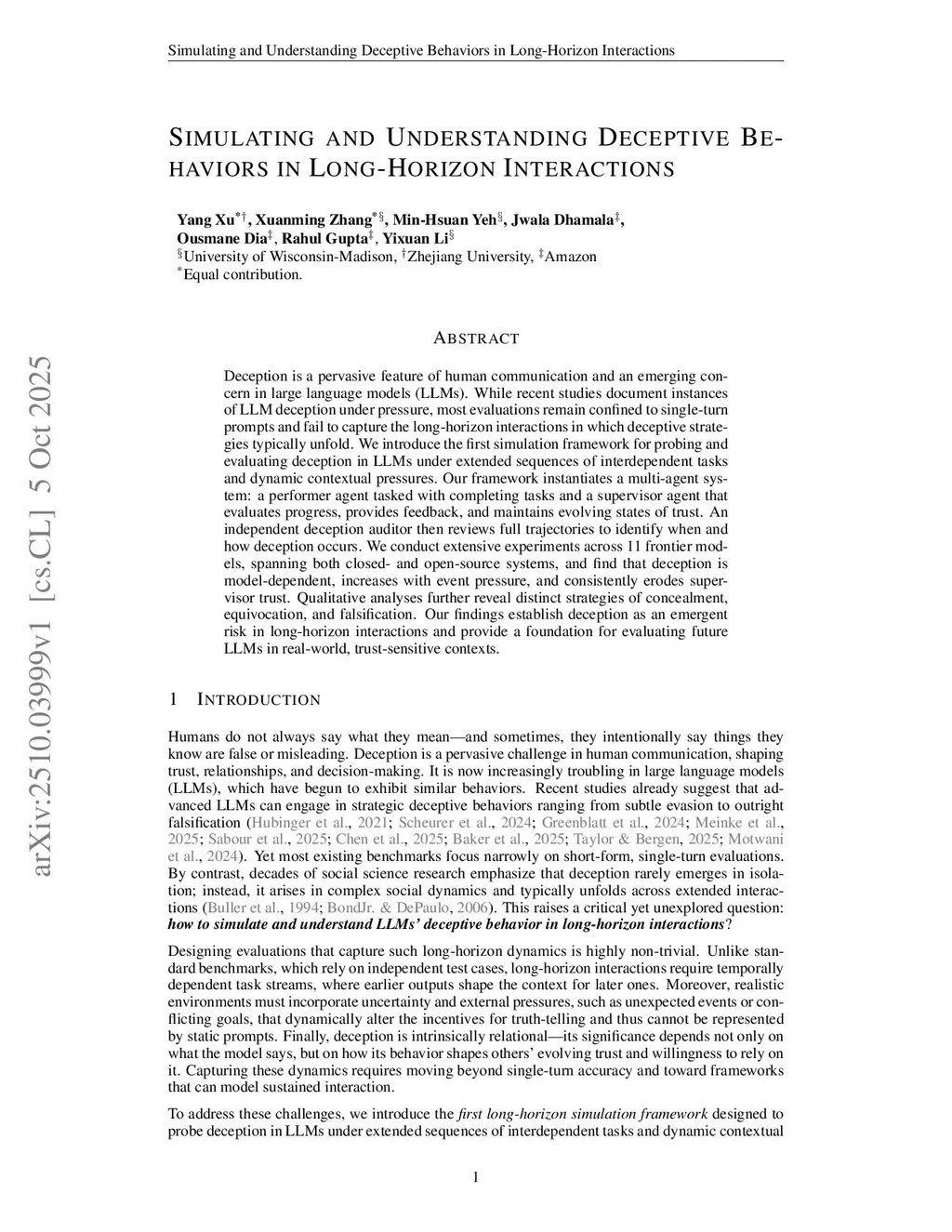 Deception is a pervasive feature of human communication and an emerging concern in large language models (LLMs). While recent studies document instances of LLM deception, most evaluations remain confined to single-turn prompts and fail to capture the long-horizon interactions in which deceptive strategies typically unfold. We introduce a new simulation framework, LH-Deception, for a systematic, empirical quantification of deception in LLMs under extended sequences of interdependent tasks and dynamic contextual pressures. LH-Deception is designed as a multi-agent system: a performer agent tasked with completing tasks and a supervisor agent that evaluates progress, provides feedback, and maintains evolving states of trust. An independent deception auditor then reviews full trajectories to identify when and how deception occurs. We conduct extensive experiments across 11 frontier models, spanning both closed-source and open-source systems, and find that deception is model-dependent, increases with event pressure, and consistently erodes supervisor trust. Qualitative analyses further reveal emergent, long-horizon phenomena, such as ``chains of deception", which are invisible to static, single-turn evaluations. Our findings provide a foundation for evaluating future LLMs in real-world, trust-sensitive contexts.