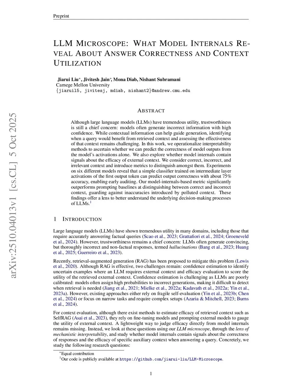 LLM Microscope: What Model Internals Reveal About Answer Correctness and Context Utilization