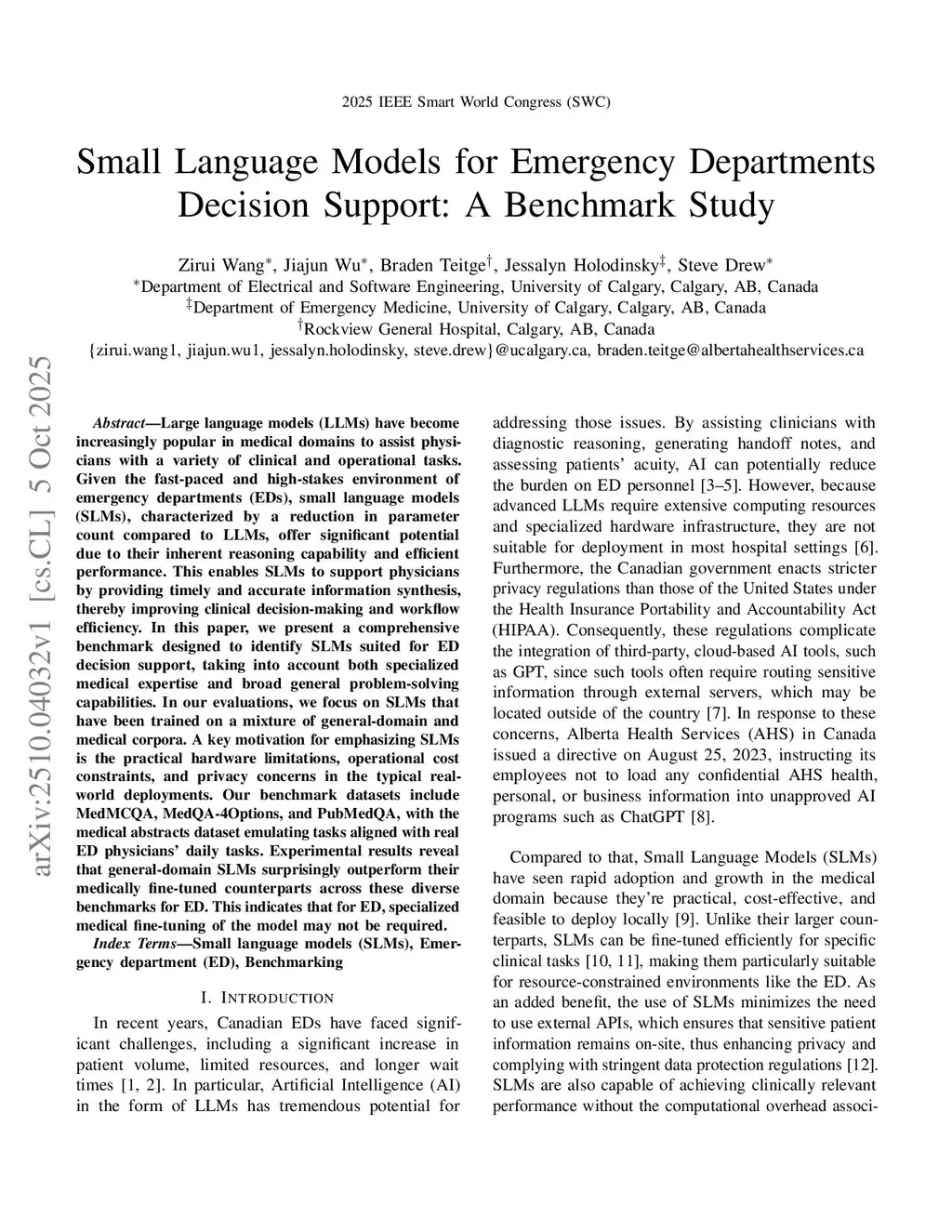 Small Language Models for Emergency Departments Decision Support: A Benchmark Study
