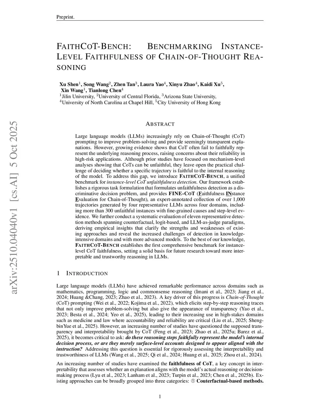 Large language models (LLMs) increasingly rely on Chain-of-Thought (CoT) prompting to improve problem-solving and provide seemingly transparent explanations. However, growing evidence shows that CoT often fail to faithfully represent the underlying reasoning process, raising concerns about their reliability in high-risk applications. Although prior studies have focused on mechanism-level analyses showing that CoTs can be unfaithful, they leave open the practical challenge of deciding whether a specific trajectory is faithful to the internal reasoning of the model. To address this gap, we introduce FaithCoT-Bench, a unified benchmark for instance-level CoT unfaithfulness detection. Our framework establishes a rigorous task formulation that formulates unfaithfulness detection as a discriminative decision problem, and provides FINE-CoT (Faithfulness instance evaluation for Chain-of-Thought), an expert-annotated collection of over 1,000 trajectories generated by four representative LLMs across four domains, including more than 300 unfaithful instances with fine-grained causes and step-level evidence. We further conduct a systematic evaluation of eleven representative detection methods spanning counterfactual, logit-based, and LLM-as-judge paradigms, deriving empirical insights that clarify the strengths and weaknesses of existing approaches and reveal the increased challenges of detection in knowledge-intensive domains and with more advanced models. To the best of our knowledge, FaithCoT-Bench establishes the first comprehensive benchmark for instance-level CoT faithfulness, setting a solid basis for future research toward more interpretable and trustworthy reasoning in LLMs.