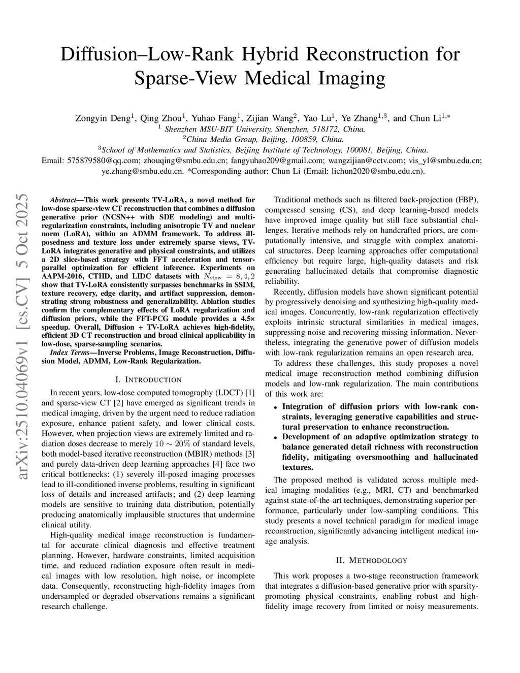 This work presents TV-LoRA, a novel method for low-dose sparse-view CT reconstruction that combines a diffusion generative prior (NCSN++ with SDE modeling) and multi-regularization constraints, including anisotropic TV and nuclear norm (LoRA), within an ADMM framework. To address ill-posedness and texture loss under extremely sparse views, TV-LoRA integrates generative and physical constraints, and utilizes a 2D slice-based strategy with FFT acceleration and tensor-parallel optimization for efficient inference. Experiments on AAPM-2016, CTHD, and LIDC datasets with show that TV-LoRA consistently surpasses benchmarks in SSIM, texture recovery, edge clarity, and artifact suppression, demonstrating strong robustness and generalizability. Ablation studies confirm the complementary effects of LoRA regularization and diffusion priors, while the FFT-PCG module provides a speedup. Overall, Diffusion + TV-LoRA achieves high-fidelity, efficient 3D CT reconstruction and broad clinical applicability in low-dose, sparse-sampling scenarios.