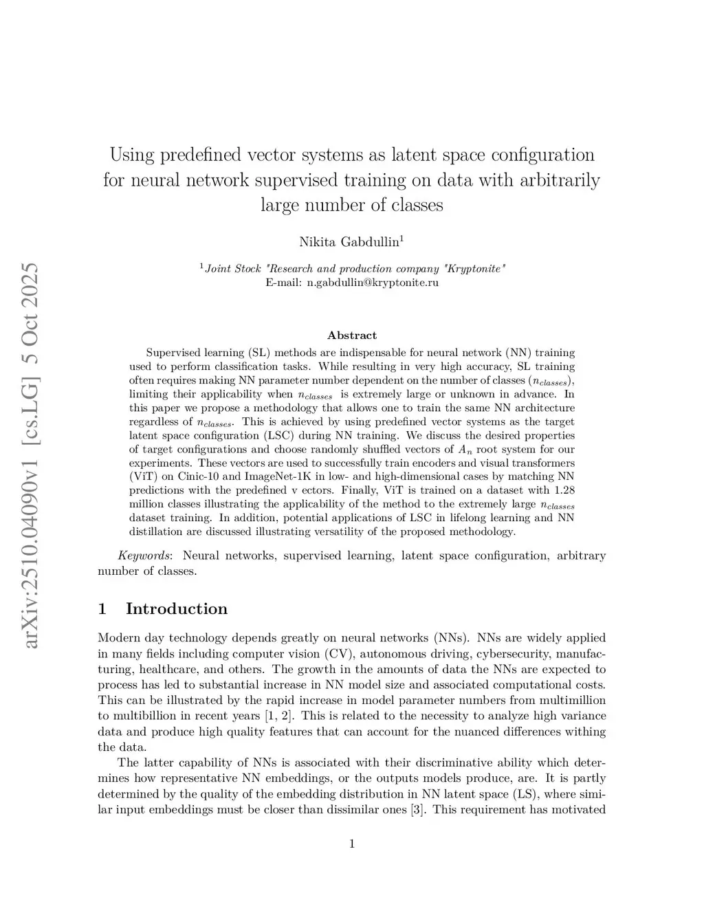 Using predefined vector systems as latent space configuration for neural network supervised training on data with arbitrarily large number of classes