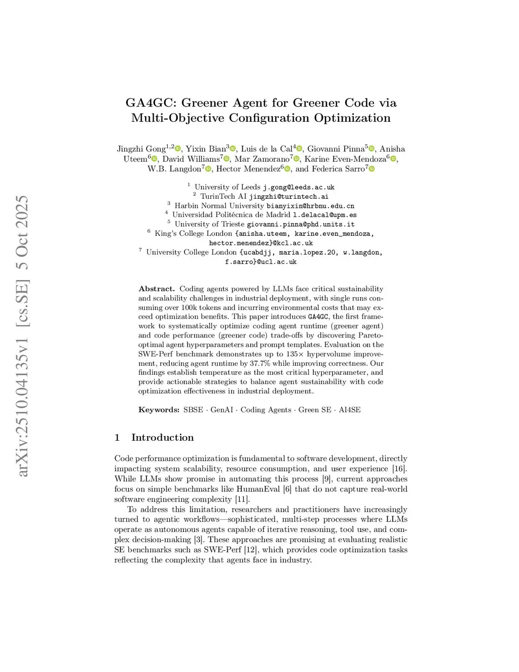 Coding agents powered by LLMs face critical sustainability and scalability challenges in industrial deployment, with single runs consuming over 100k tokens and incurring environmental costs that may exceed optimization benefits. This paper introduces GA4GC, the first framework to systematically optimize coding agent runtime (greener agent) and code performance (greener code) trade-offs by discovering Pareto-optimal agent hyperparameters and prompt templates. Evaluation on the SWE-Perf benchmark demonstrates up to 135x hypervolume improvement, reducing agent runtime by 37.7% while improving correctness. Our findings establish temperature as the most critical hyperparameter, and provide actionable strategies to balance agent sustainability with code optimization effectiveness in industrial deployment.