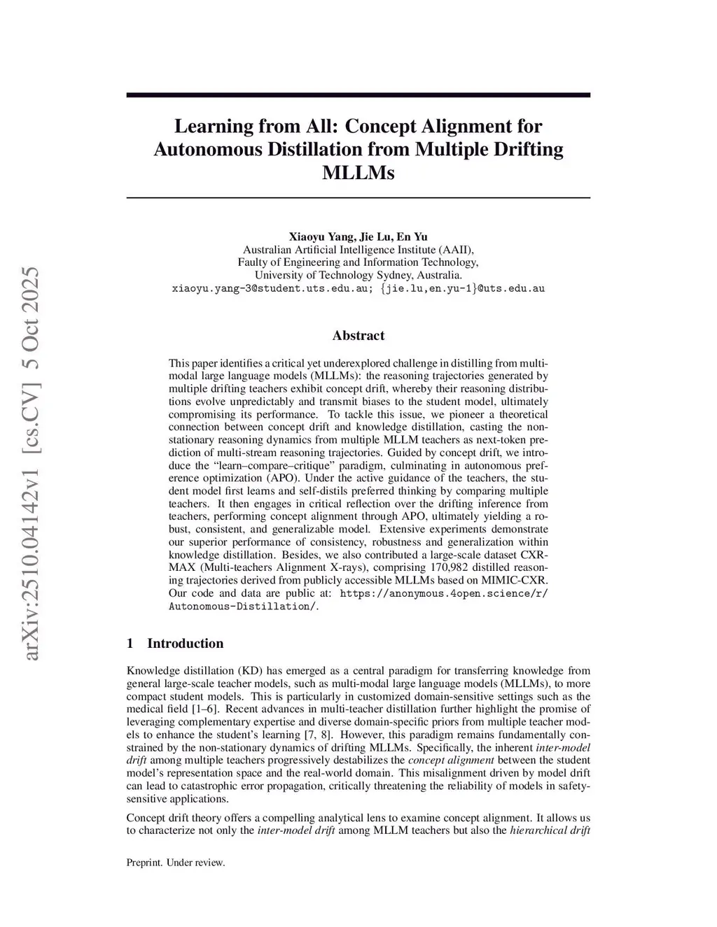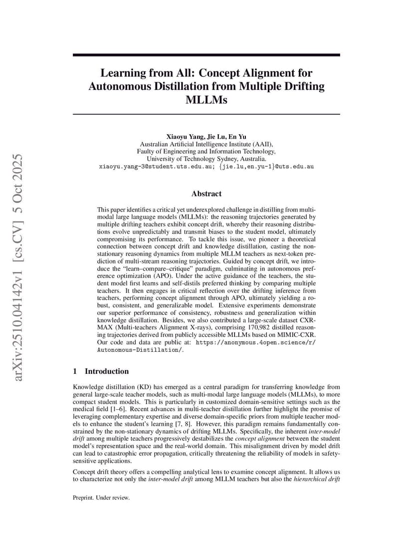 This paper identifies a critical yet underexplored challenge in distilling from multimodal large language models (MLLMs): the reasoning trajectories generated by multiple drifting teachers exhibit concept drift, whereby their reasoning distributions evolve unpredictably and transmit biases to the student model, ultimately compromising its performance. To tackle this issue, we pioneer a theoretical connection between concept drift and knowledge distillation, casting the non-stationary reasoning dynamics from multiple MLLM teachers as next-token prediction of multi-stream reasoningthis http URLby concept drift, we introduce the "learn, compare, critique" paradigm, culminating in autonomous preference optimization (APO). Under the active guidance of the teachers, the student model first learns and self-distils preferred thinking by comparing multiple teachers. It then engages in critical reflection over the drifting inference from teachers, performing concept alignment through APO, ultimately yielding a robust, consistent, and generalizablethis http URLexperiments demonstrate our superior performance of consistency, robustness and generalization within knowledge distillation. Besides, we also contributed a large-scale dataset, CXR-MAX (Multi-teachers Alignment X-rays), comprising 170,982 distilled reasoning trajectories derived from publicly accessible MLLMs based on MIMIC-CXR. Our code and data are public at:this https URL.