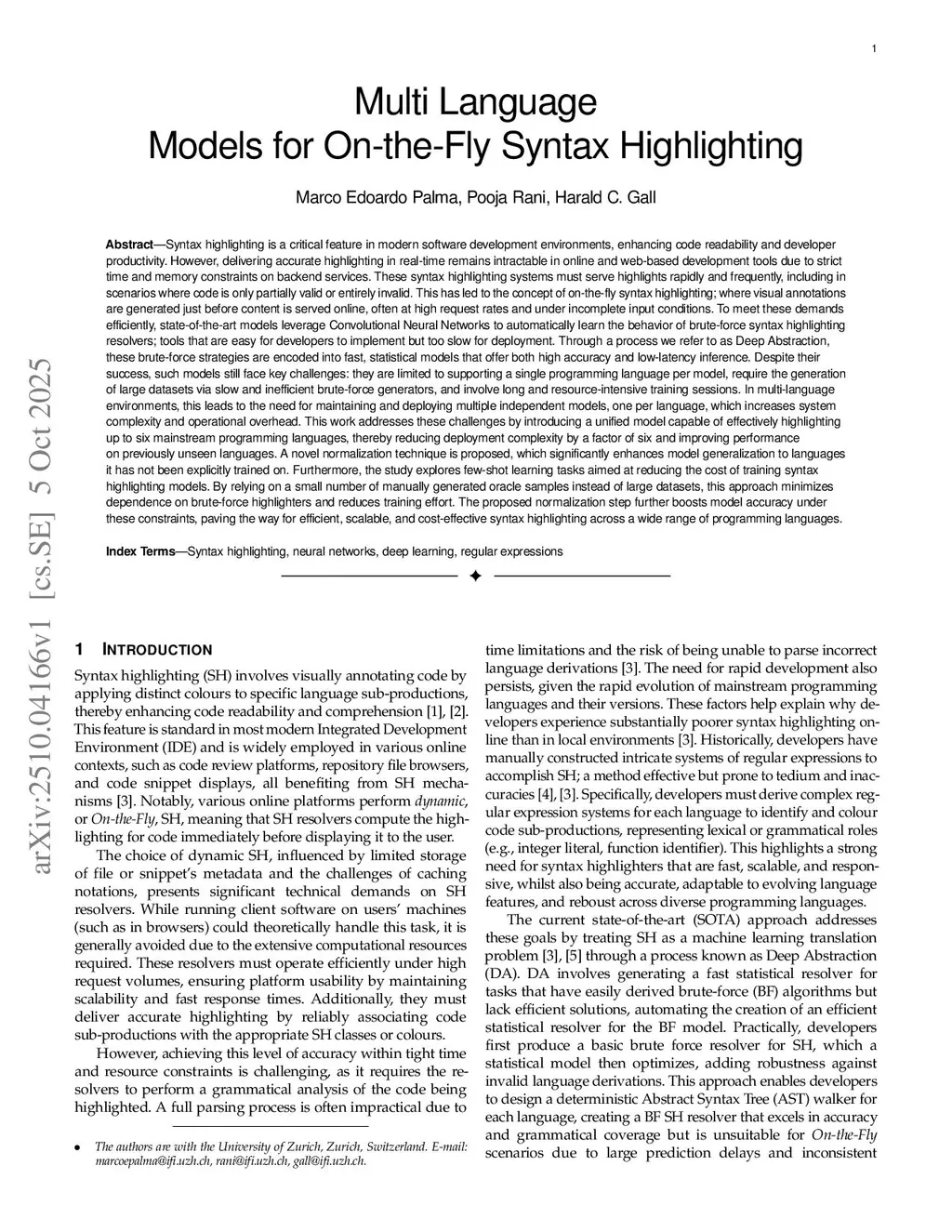 Syntax highlighting is a critical feature in modern software development environments, enhancing code readability and developer productivity. However, delivering accurate highlighting in real time remains challenging for online and web-based development tools due to strict time and memory constraints on backend services. These systems must serve highlights rapidly and frequently, even when code is partially valid or invalid. This has led to on-the-fly syntax highlighting, where visual annotations are generated just before content is served, often at high request rates and under incomplete input conditions. To meet these demands efficiently, state-of-the-art models use deep learning to learn the behavior of brute-force syntax highlighting resolvers, tools that are easy to implement but too slow for production. Through the Deep Abstraction process, brute-force strategies are encoded into fast statistical models that achieve both high accuracy and low-latency inference. Despite their success, such models face key challenges: they support only one programming language per model, require large datasets from slow brute-force generators, and involve resource-intensive training. In multi-language environments, this means maintaining multiple independent models, increasing system complexity and operational cost. This work addresses these issues by introducing a unified model capable of highlighting up to six mainstream programming languages, reducing deployment complexity by a factor of six and improving performance on unseen languages. A novel normalization technique significantly enhances model generalization, while few-shot learning experiments show that a small number of oracle samples can replace large datasets, minimizing dependence on brute-force generators. Combined, these innovations enable efficient, scalable, and cost-effective syntax highlighting across diverse programming languages.