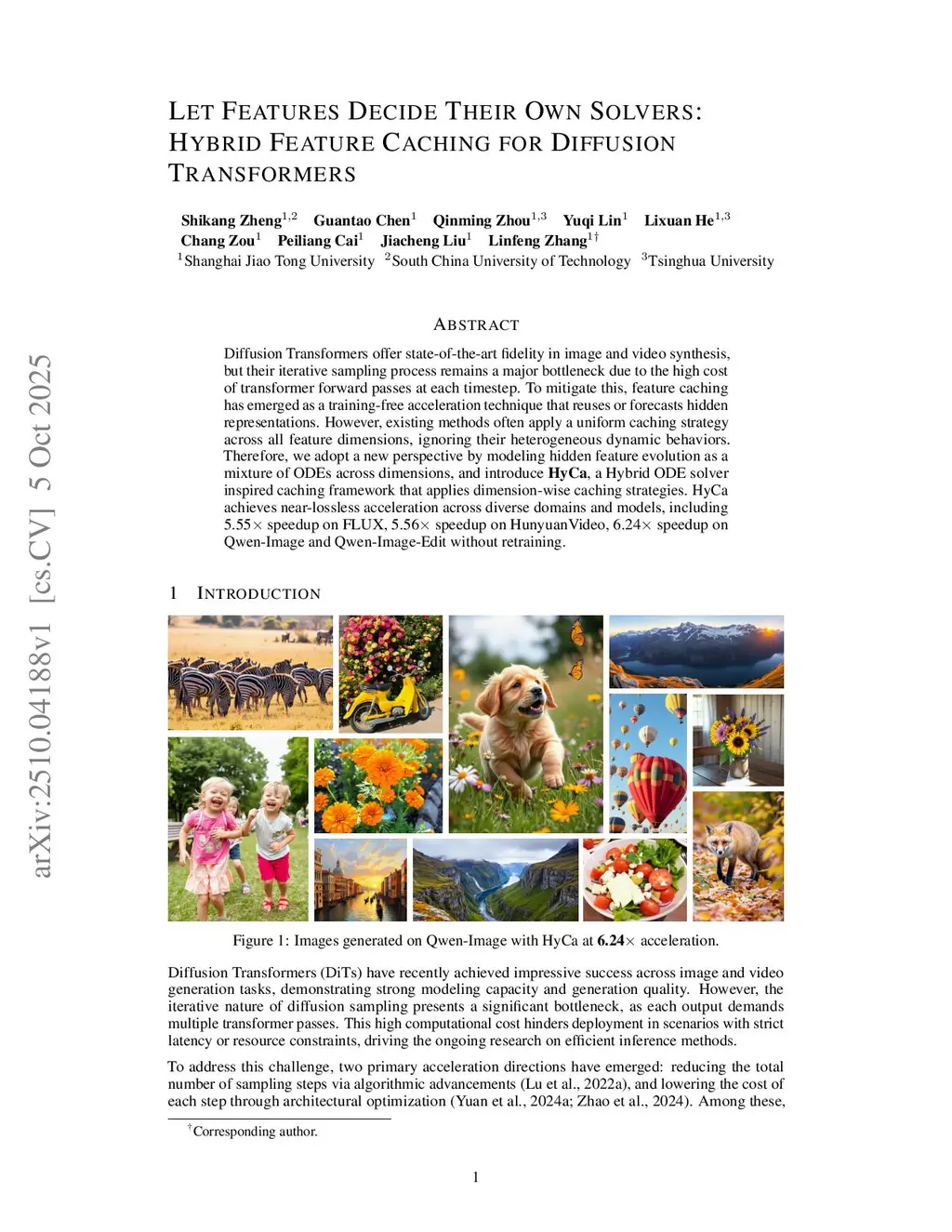 Diffusion Transformers offer state-of-the-art fidelity in image and video synthesis, but their iterative sampling process remains a major bottleneck due to the high cost of transformer forward passes at each timestep. To mitigate this, feature caching has emerged as a training-free acceleration technique that reuses or forecasts hidden representations. However, existing methods often apply a uniform caching strategy across all feature dimensions, ignoring their heterogeneous dynamic behaviors. Therefore, we adopt a new perspective by modeling hidden feature evolution as a mixture of ODEs across dimensions, and introduce HyCa, a Hybrid ODE solver inspired caching framework that applies dimension-wise caching strategies. HyCa achieves near-lossless acceleration across diverse domains and models, including 5.55 times speedup on FLUX, 5.56 times speedup on HunyuanVideo, 6.24 times speedup on Qwen-Image and Qwen-Image-Edit without retraining.