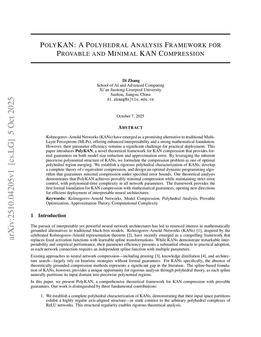 Kolmogorov-Arnold Networks (KANs) have emerged as a promising alternative to traditional Multi-Layer Perceptrons (MLPs), offering enhanced interpretability and a solid mathematical foundation. However, their parameter efficiency remains a significant challenge for practical deployment. This paper introduces PolyKAN, a novel theoretical framework for KAN compression that provides formal guarantees on both model size reduction and approximation error. By leveraging the inherent piecewise polynomial structure of KANs, we formulate the compression problem as a polyhedral region merging task. We establish a rigorous polyhedral characterization of KANs, develop a complete theory of -equivalent compression, and design a dynamic programming algorithm that achieves approximately optimal compression under specified error bounds. Our theoretical analysis demonstrates that PolyKAN achieves provably near-optimal compression while maintaining strict error control, with guaranteed global optimality for univariate spline functions. This framework provides the first formal foundation for KAN compression with mathematical guarantees, opening new directions for the efficient deployment of interpretable neural architectures.