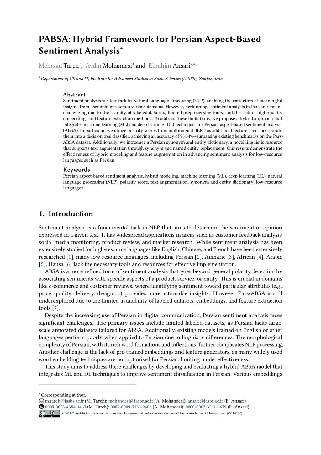 Sentiment analysis is a key task in Natural Language Processing (NLP), enabling the extraction of meaningful insights from user opinions across various domains. However, performing sentiment analysis in Persian remains challenging due to the scarcity of labeled datasets, limited preprocessing tools, and the lack of high-quality embeddings and feature extraction methods. To address these limitations, we propose a hybrid approach that integrates machine learning (ML) and deep learning (DL) techniques for Persian aspect-based sentiment analysis (ABSA). In particular, we utilize polarity scores from multilingual BERT as additional features and incorporate them into a decision tree classifier, achieving an accuracy of 93.34%-surpassing existing benchmarks on the Pars-ABSA dataset. Additionally, we introduce a Persian synonym and entity dictionary, a novel linguistic resource that supports text augmentation through synonym and named entity replacement. Our results demonstrate the effectiveness of hybrid modeling and feature augmentation in advancing sentiment analysis for low-resource languages such as Persian.