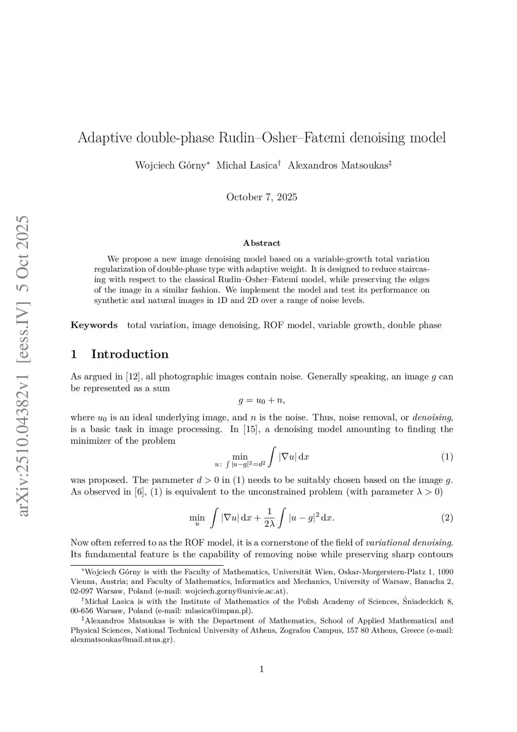Adaptive double-phase Rudin--Osher--Fatemi denoising model
