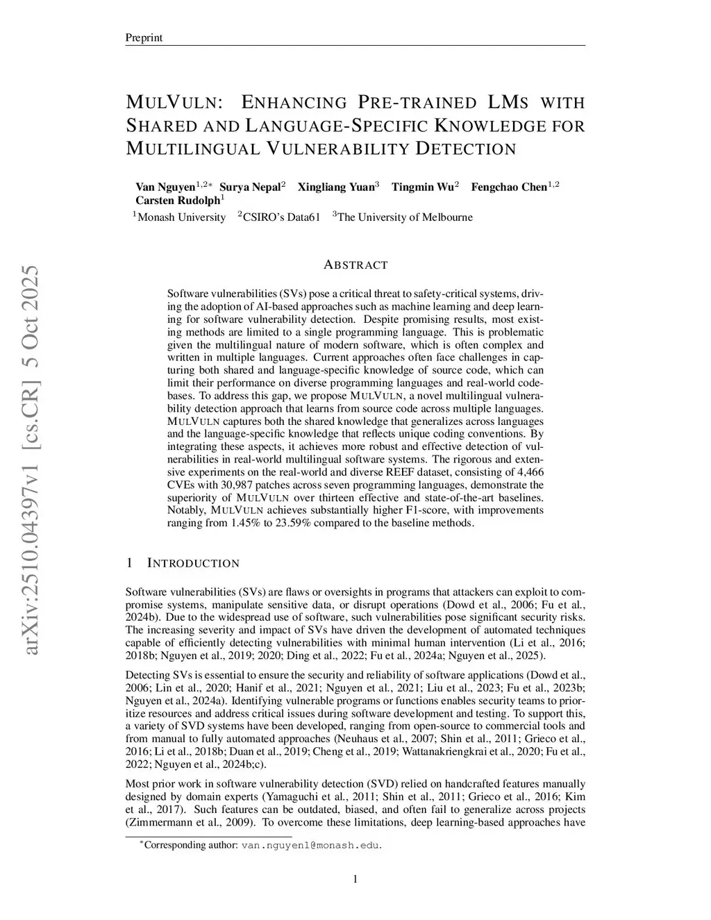 Software vulnerabilities (SVs) pose a critical threat to safety-critical systems, driving the adoption of AI-based approaches such as machine learning and deep learning for software vulnerability detection. Despite promising results, most existing methods are limited to a single programming language. This is problematic given the multilingual nature of modern software, which is often complex and written in multiple languages. Current approaches often face challenges in capturing both shared and language-specific knowledge of source code, which can limit their performance on diverse programming languages and real-world codebases. To address this gap, we propose MULVULN, a novel multilingual vulnerability detection approach that learns from source code across multiple languages. MULVULN captures both the shared knowledge that generalizes across languages and the language-specific knowledge that reflects unique coding conventions. By integrating these aspects, it achieves more robust and effective detection of vulnerabilities in real-world multilingual software systems. The rigorous and extensive experiments on the real-world and diverse REEF dataset, consisting of 4,466 CVEs with 30,987 patches across seven programming languages, demonstrate the superiority of MULVULN over thirteen effective and state-of-the-art baselines. Notably, MULVULN achieves substantially higher F1-score, with improvements ranging from 1.45% to 23.59% compared to the baseline methods.