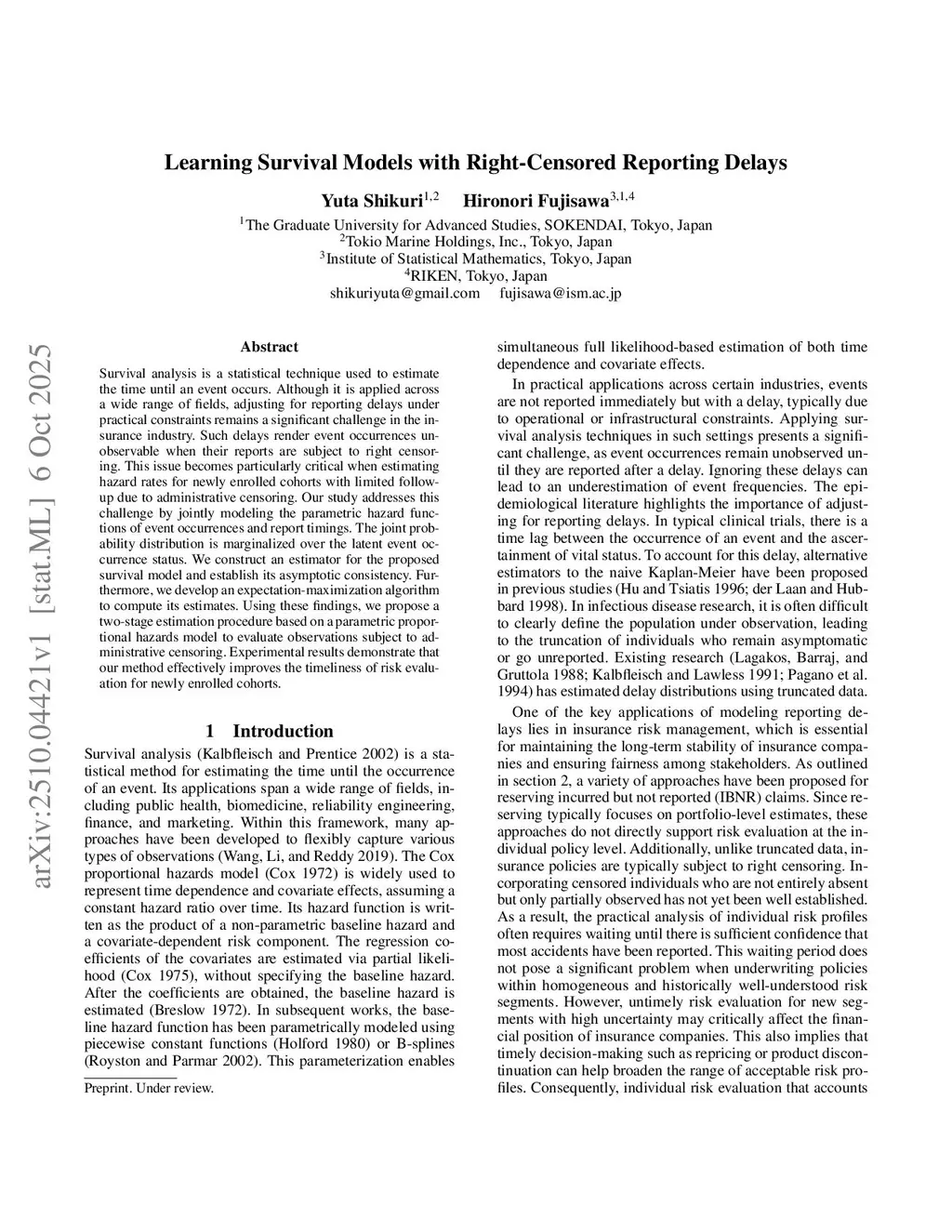 Survival analysis is a statistical technique used to estimate the time until an event occurs. Although it is applied across a wide range of fields, adjusting for reporting delays under practical constraints remains a significant challenge in the insurance industry. Such delays render event occurrences unobservable when their reports are subject to right censoring. This issue becomes particularly critical when estimating hazard rates for newly enrolled cohorts with limited follow-up due to administrative censoring. Our study addresses this challenge by jointly modeling the parametric hazard functions of event occurrences and report timings. The joint probability distribution is marginalized over the latent event occurrence status. We construct an estimator for the proposed survival model and establish its asymptotic consistency. Furthermore, we develop an expectation-maximization algorithm to compute its estimates. Using these findings, we propose a two-stage estimation procedure based on a parametric proportional hazards model to evaluate observations subject to administrative censoring. Experimental results demonstrate that our method effectively improves the timeliness of risk evaluation for newly enrolled cohorts.