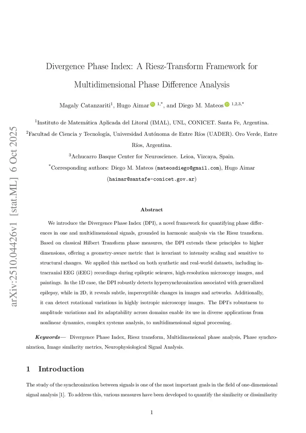 We introduce the Divergence Phase Index (DPI), a novel framework for quantifying phase differences in one and multidimensional signals, grounded in harmonic analysis via the Riesz transform. Based on classical Hilbert Transform phase measures, the DPI extends these principles to higher dimensions, offering a geometry-aware metric that is invariant to intensity scaling and sensitive to structural changes. We applied this method on both synthetic and real-world datasets, including intracranial EEG (iEEG) recordings during epileptic seizures, high-resolution microscopy images, and paintings. In the 1D case, the DPI robustly detects hypersynchronization associated with generalized epilepsy, while in 2D, it reveals subtle, imperceptible changes in images and artworks. Additionally, it can detect rotational variations in highly isotropic microscopy images. The DPI's robustness to amplitude variations and its adaptability across domains enable its use in diverse applications from nonlinear dynamics, complex systems analysis, to multidimensional signal processing.