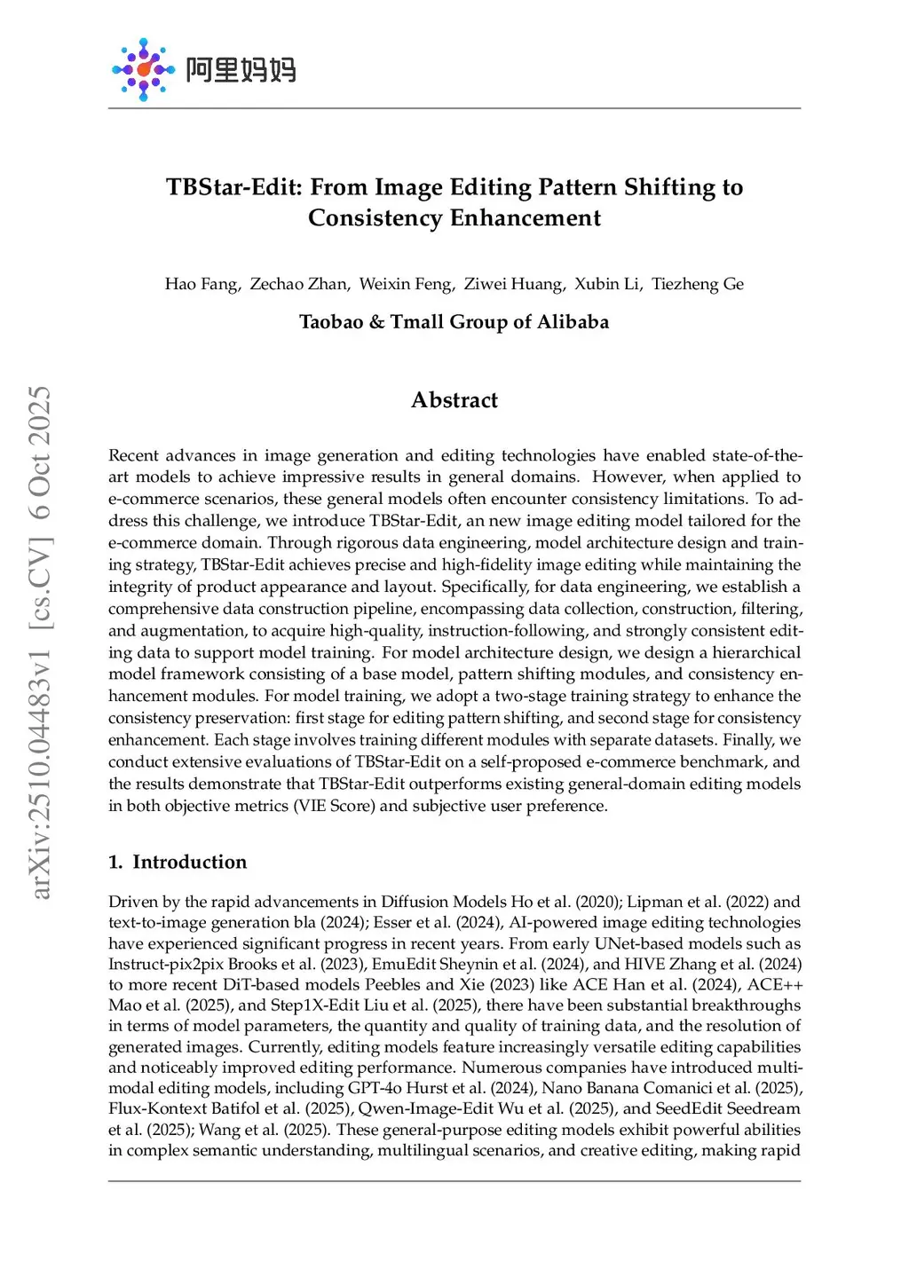Recent advances in image generation and editing technologies have enabled state-of-the-art models to achieve impressive results in general domains. However, when applied to e-commerce scenarios, these general models often encounter consistency limitations. To address this challenge, we introduce TBStar-Edit, an new image editing model tailored for the e-commerce domain. Through rigorous data engineering, model architecture design and training strategy, TBStar-Edit achieves precise and high-fidelity image editing while maintaining the integrity of product appearance and layout. Specifically, for data engineering, we establish a comprehensive data construction pipeline, encompassing data collection, construction, filtering, and augmentation, to acquire high-quality, instruction-following, and strongly consistent editing data to support model training. For model architecture design, we design a hierarchical model framework consisting of a base model, pattern shifting modules, and consistency enhancement modules. For model training, we adopt a two-stage training strategy to enhance the consistency preservation: first stage for editing pattern shifting, and second stage for consistency enhancement. Each stage involves training different modules with separate datasets. Finally, we conduct extensive evaluations of TBStar-Edit on a self-proposed e-commerce benchmark, and the results demonstrate that TBStar-Edit outperforms existing general-domain editing models in both objective metrics (VIE Score) and subjective user preference.