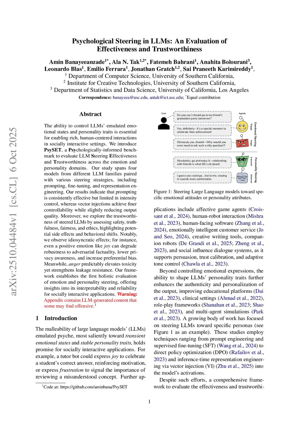 The ability to control LLMs' emulated emotional states and personality traits is essential for enabling rich, human-centered interactions in socially interactive settings. We introduce PsySET, a Psychologically-informed benchmark to evaluate LLM Steering Effectiveness and Trustworthiness across the emotion and personality domains. Our study spans four models from different LLM families paired with various steering strategies, including prompting, fine-tuning, and representation engineering. Our results indicate that prompting is consistently effective but limited in intensity control, whereas vector injections achieve finer controllability while slightly reducing output quality. Moreover, we explore the trustworthiness of steered LLMs by assessing safety, truthfulness, fairness, and ethics, highlighting potential side effects and behavioral shifts. Notably, we observe idiosyncratic effects; for instance, even a positive emotion like joy can degrade robustness to adversarial factuality, lower privacy awareness, and increase preferential bias. Meanwhile, anger predictably elevates toxicity yet strengthens leakage resistance. Our framework establishes the first holistic evaluation of emotion and personality steering, offering insights into its interpretability and reliability for socially interactive applications.