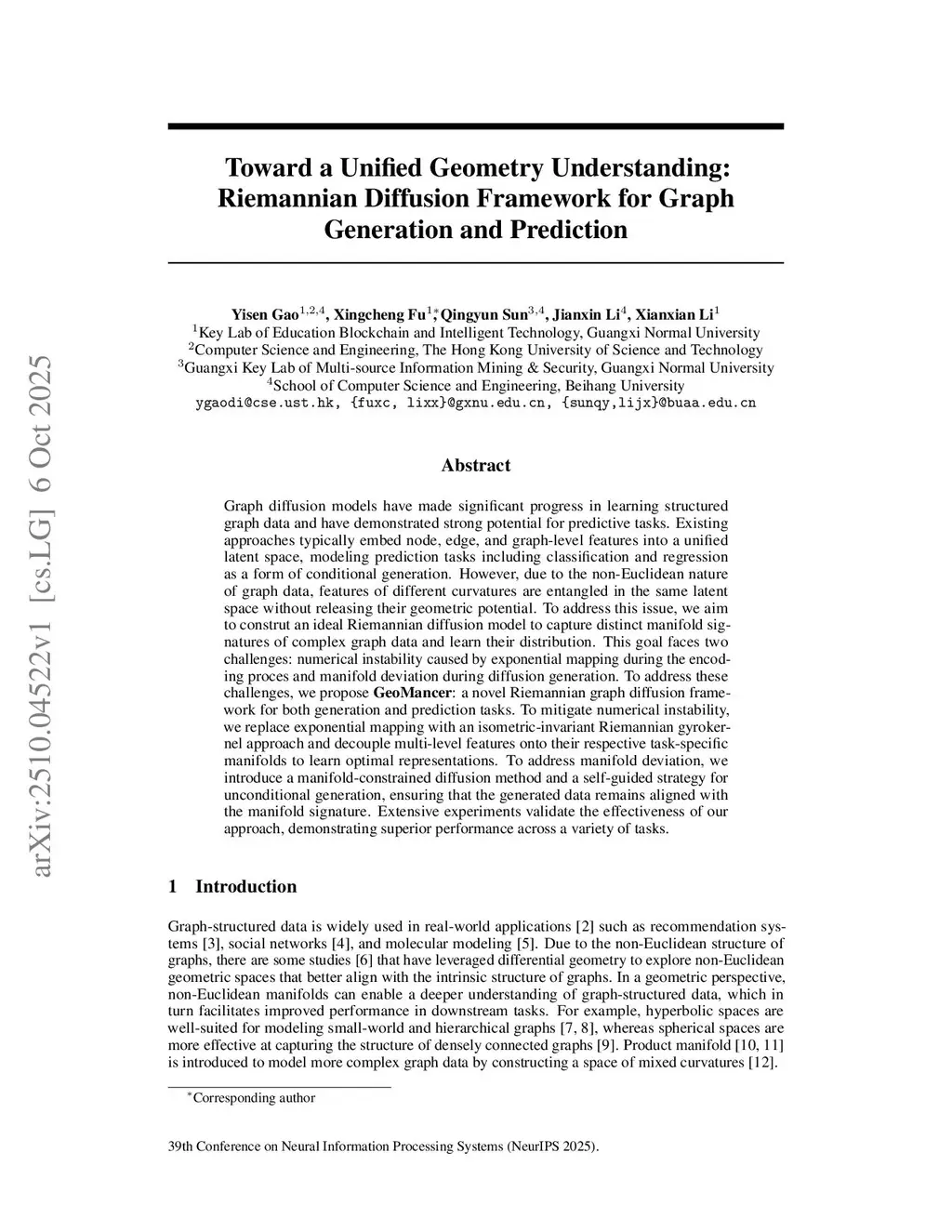 Graph diffusion models have made significant progress in learning structured graph data and have demonstrated strong potential for predictive tasks. Existing approaches typically embed node, edge, and graph-level features into a unified latent space, modeling prediction tasks including classification and regression as a form of conditional generation. However, due to the non-Euclidean nature of graph data, features of different curvatures are entangled in the same latent space without releasing their geometric potential. To address this issue, we aim to construt an ideal Riemannian diffusion model to capture distinct manifold signatures of complex graph data and learn their distribution. This goal faces two challenges: numerical instability caused by exponential mapping during the encoding proces and manifold deviation during diffusion generation. To address these challenges, we propose GeoMancer: a novel Riemannian graph diffusion framework for both generation and prediction tasks. To mitigate numerical instability, we replace exponential mapping with an isometric-invariant Riemannian gyrokernel approach and decouple multi-level features onto their respective task-specific manifolds to learn optimal representations. To address manifold deviation, we introduce a manifold-constrained diffusion method and a self-guided strategy for unconditional generation, ensuring that the generated data remains aligned with the manifold signature. Extensive experiments validate the effectiveness of our approach, demonstrating superior performance across a variety of tasks.
