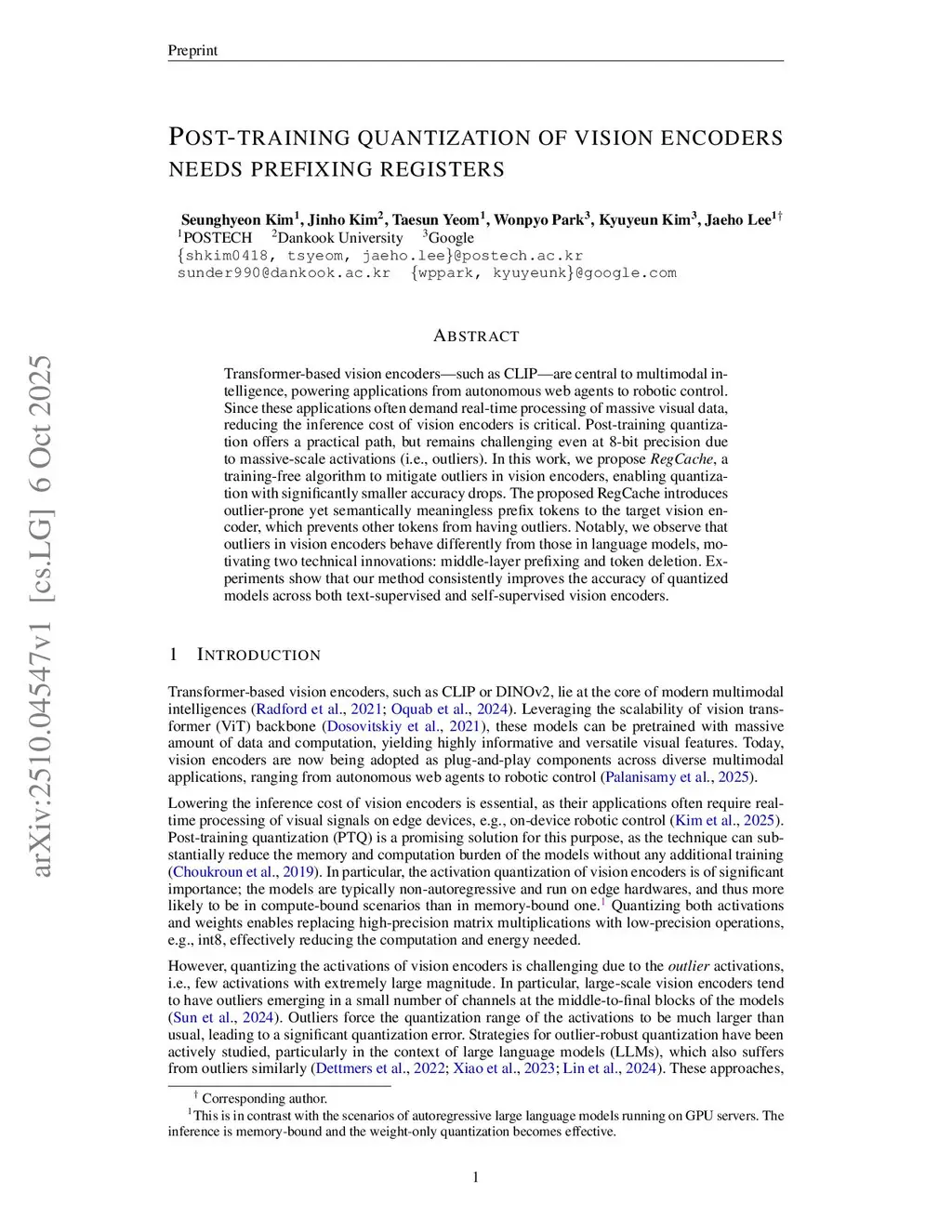 Transformer-based vision encoders -- such as CLIP -- are central to multimodal intelligence, powering applications from autonomous web agents to robotic control. Since these applications often demand real-time processing of massive visual data, reducing the inference cost of vision encoders is critical. Quantization offers a practical path, but remains challenging even at 8-bit precision due to massive-scale activations (i.e., outliers). In this work, we propose , a training-free algorithm that mitigates outliers in large-scale pretrained vision encoders and serves as a plug-in module that can be applied on top of other quantization methods. The proposed RegCache introduces outlier-prone yet semantically meaningless prefix tokens to the target vision encoder, which prevents other tokens from having outliers. Notably, we observe that outliers in vision encoders behave differently from those in language models, motivating two technical innovations: middle-layer prefixing and token deletion. Experiments show that our method consistently improves the accuracy of quantized models across both text-supervised and self-supervised vision encoders.